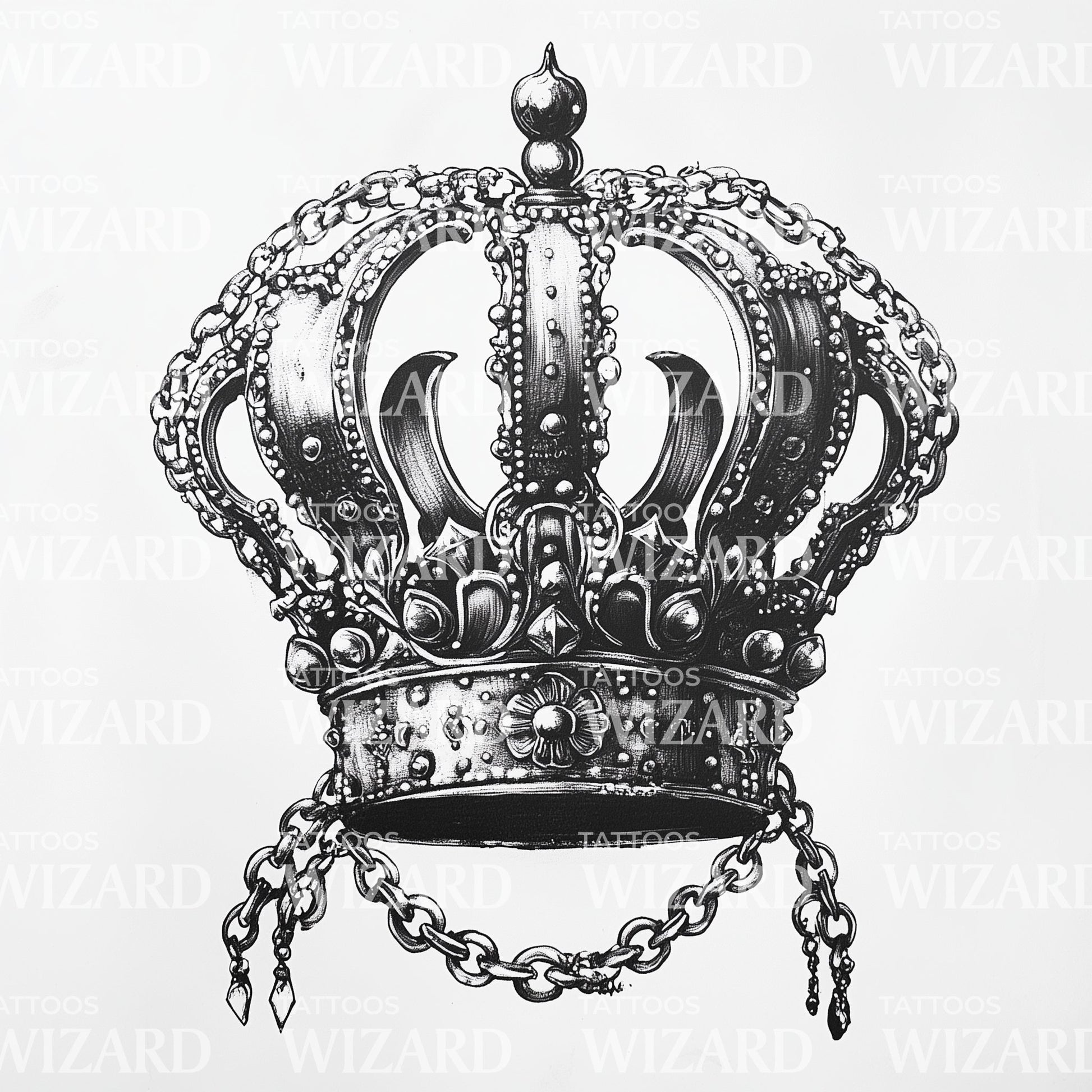 这个宏伟的黑灰色纹身设计体现了丰富的皇室遗产。展现出奢华华丽的王冠,装饰着精心制作的珠宝,彰显了威望。作为权力和贵族的永恒象征,它是那些追求皇家美学的身体艺术爱好者的理想选择。