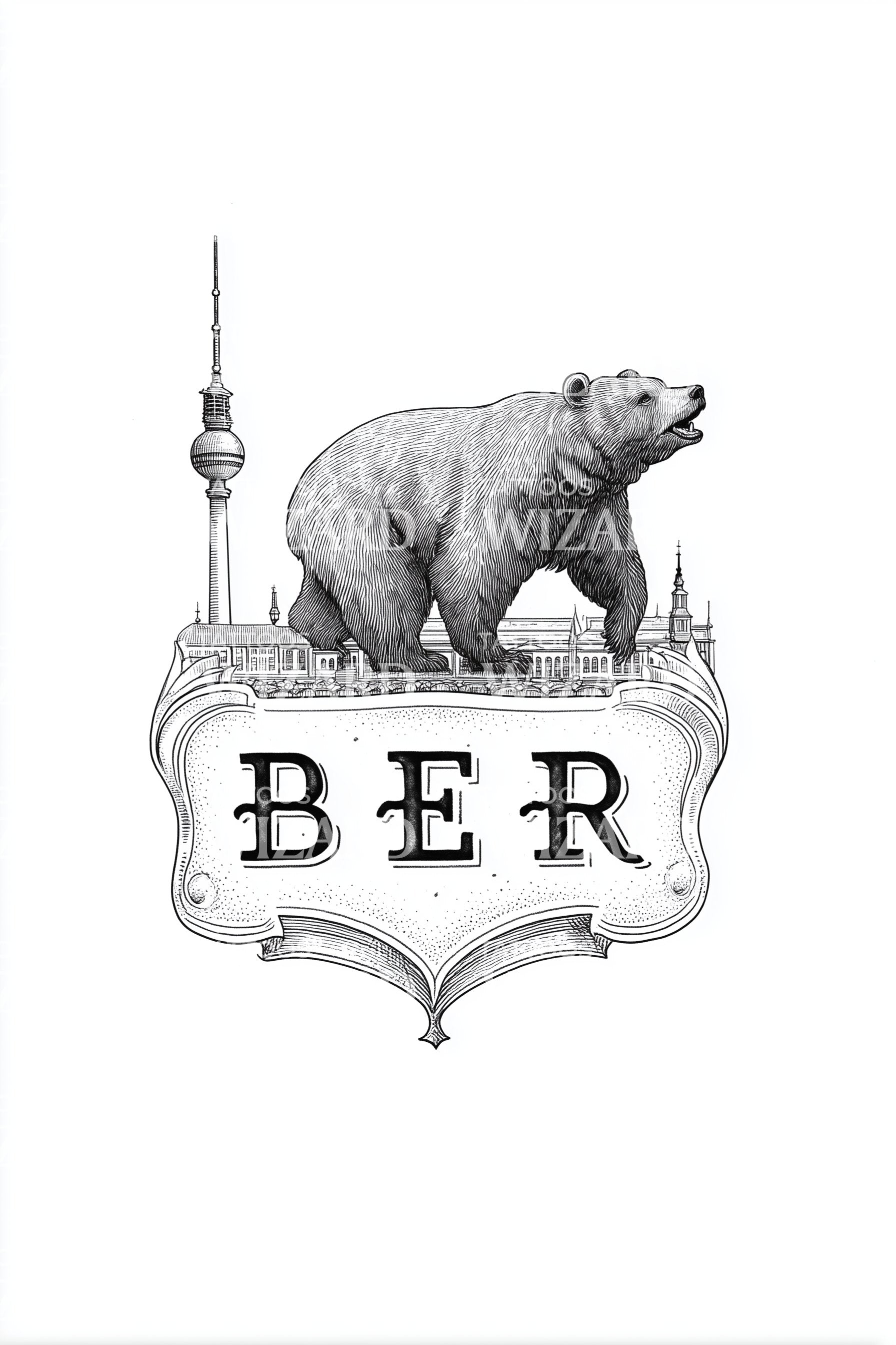 Illustrative crest of BER renders a finely inked bear striding above Berlin’s skyline, framed by ornate scrollwork and classic serif letters. The city’s icon symbolizes resilience, creativity, and protective strength. Wearing it feels grounded yet adventurous, carrying personal pride and the restless pulse of Berlin day and night.
