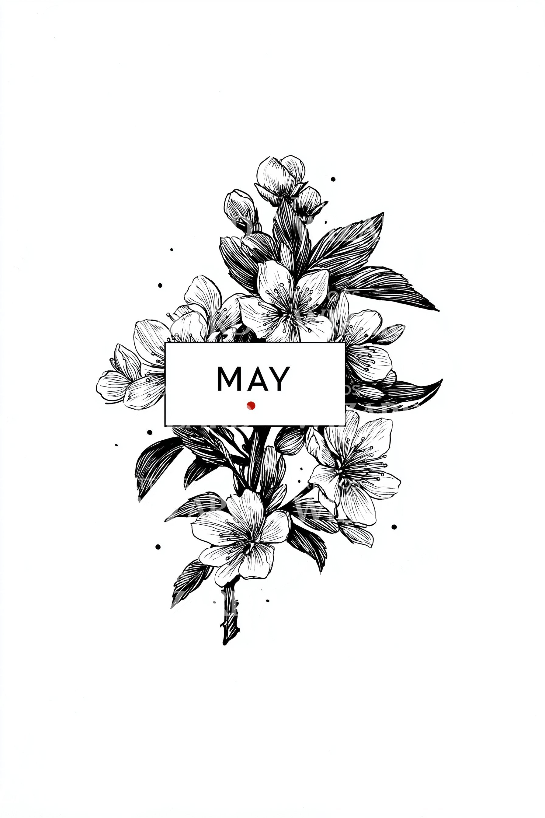 Delicate linework blossoms climb a slender branch, surrounding a crisp MAY script accented by a single red berry. Symbolizing renewal and tender beginnings, the bouquet honors nature’s turning page and the sweetness of berries. Wearing it feels like breathing spring air, a quiet vow to grow and bloom.