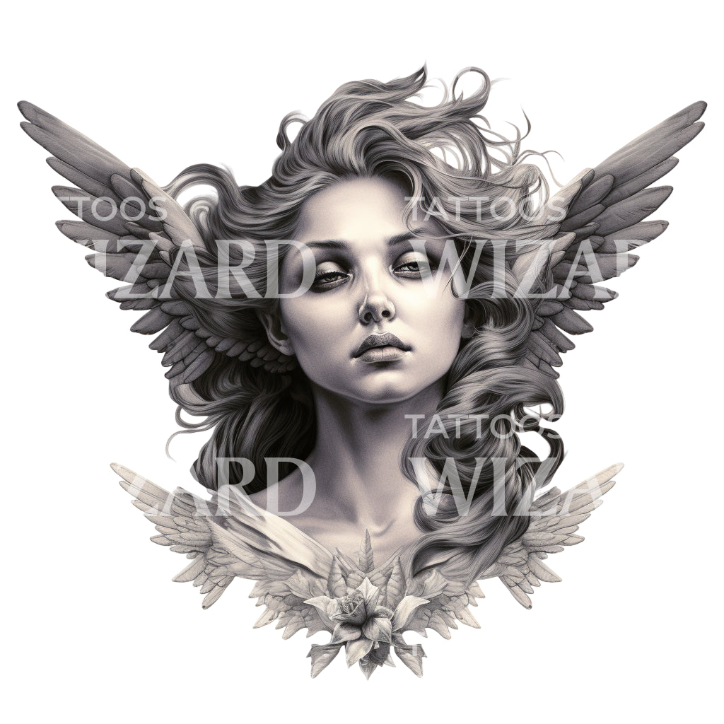 沉浸在这个黑灰色纹身设计的神秘魅力中。它展现了一位天使女性,拥有精美细致的翅膀,装饰着复杂的花朵。她的波浪形头发和深刻的肖像增添了深度和神秘感。这是一幅墨水艺术的杰作,能够捕捉你的想象力并装饰你的肌肤。