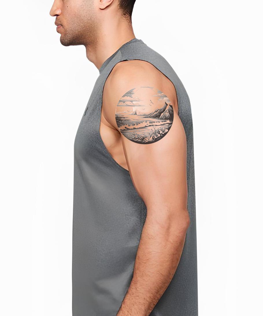 沉浸在这款黑灰色纹身设计的迷人魅力中。描绘了一个令人惊叹的海滩景观,雄伟的山脉和迷人的波浪,所有这些都以圆形布局精致呈现。这个纹身捕捉了自然的原始美和神秘,以永恒的单色调色板展现。