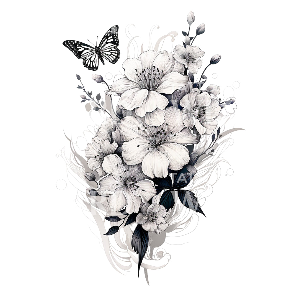沉浸在这款黑灰色纹身设计的魅力中,华丽地展示了一束花卉。作品中点缀着时尚的花朵和象征着转变的迷人蝴蝶。这个设计优雅地捕捉了自然的美丽和神秘,迷住了所有热爱花卉艺术的人。