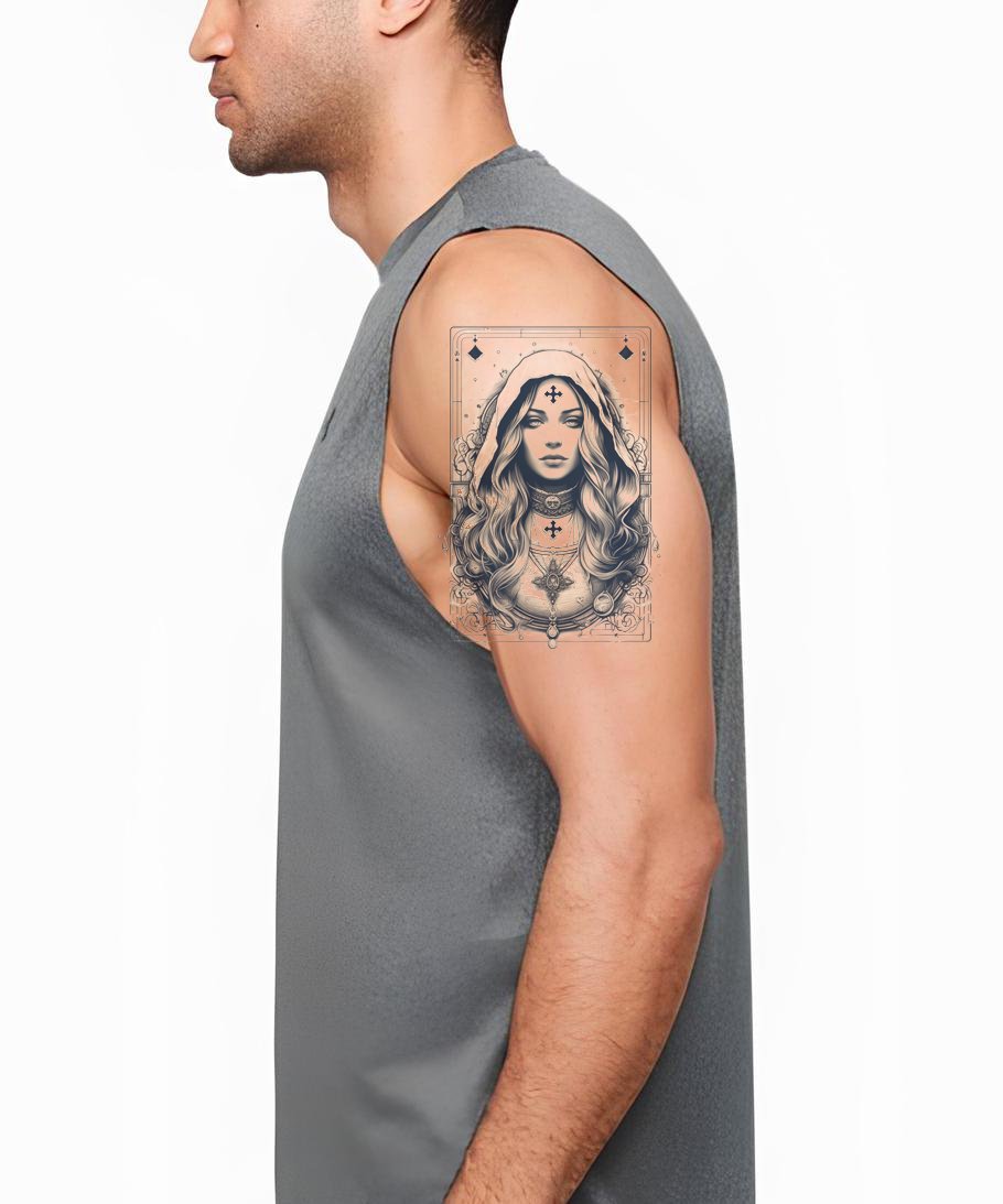 沉浸在神秘的领域中,体验我们的灰色和黑色纹身设计。设计中充满了神秘的形象,如女王、修女和塔罗牌元素,它是对那些被灵性吸引的人的强大象征。用这件精神纹身杰作将现实与神圣交织在一起。