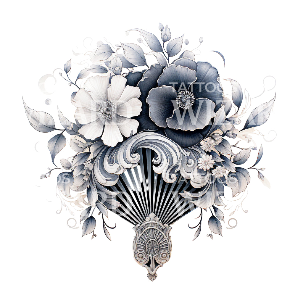 释放您独特的风格,尽享我们复古风格的黑灰色纹身设计。它以精致阴影花朵的绽放花束吸引眼球,巧妙地嵌入经典的扇形轮廓中。微微的蓝色为这件永恒的作品增添了迷人的触感 - 对于任何纹身爱好者来说,都是一个绝对的声明。