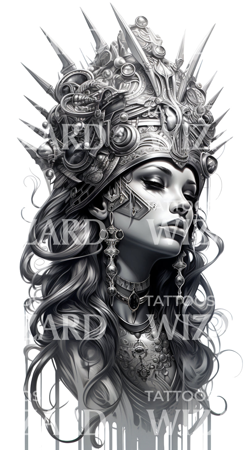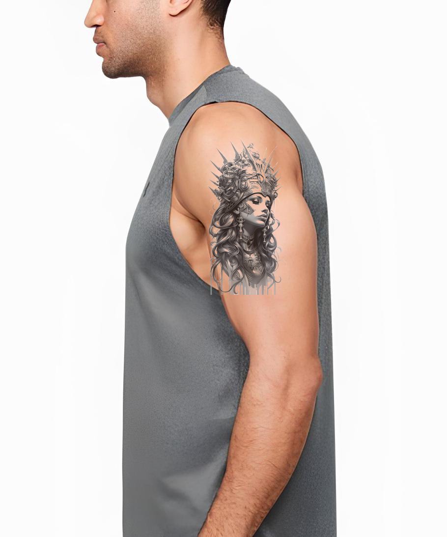 释放你内心的战士,选择这个黑灰色的纹身设计。它是幻想与现实的壮丽融合,展现了一位强大的女神,一位金属之女,手持强大的剑。这一设计不仅仅是一个纹身,它是力量与权力的见证。