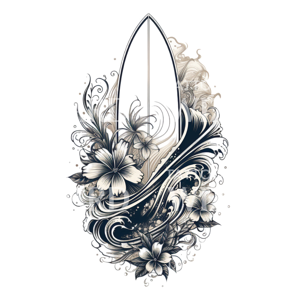 用我们的黑灰色纹身设计激发你对冲浪的热爱,艺术性地融合了海浪、冲浪板和海洋的神秘感。装饰着热带木槿花,这个图案将把你的肌肤变成对迷人海滩氛围的颂歌。今天就留下你的印记吧!