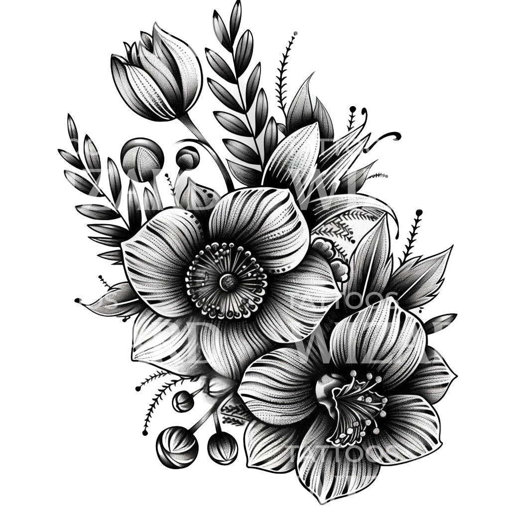 沉浸在这个黑色纹身设计的优雅中。精美细致的牡丹和各种花卉的花束,杰作融合了点刺和黑灰美学。散发出永恒的魅力,这个花卉主题象征着成长、重生和春天的希望本质。