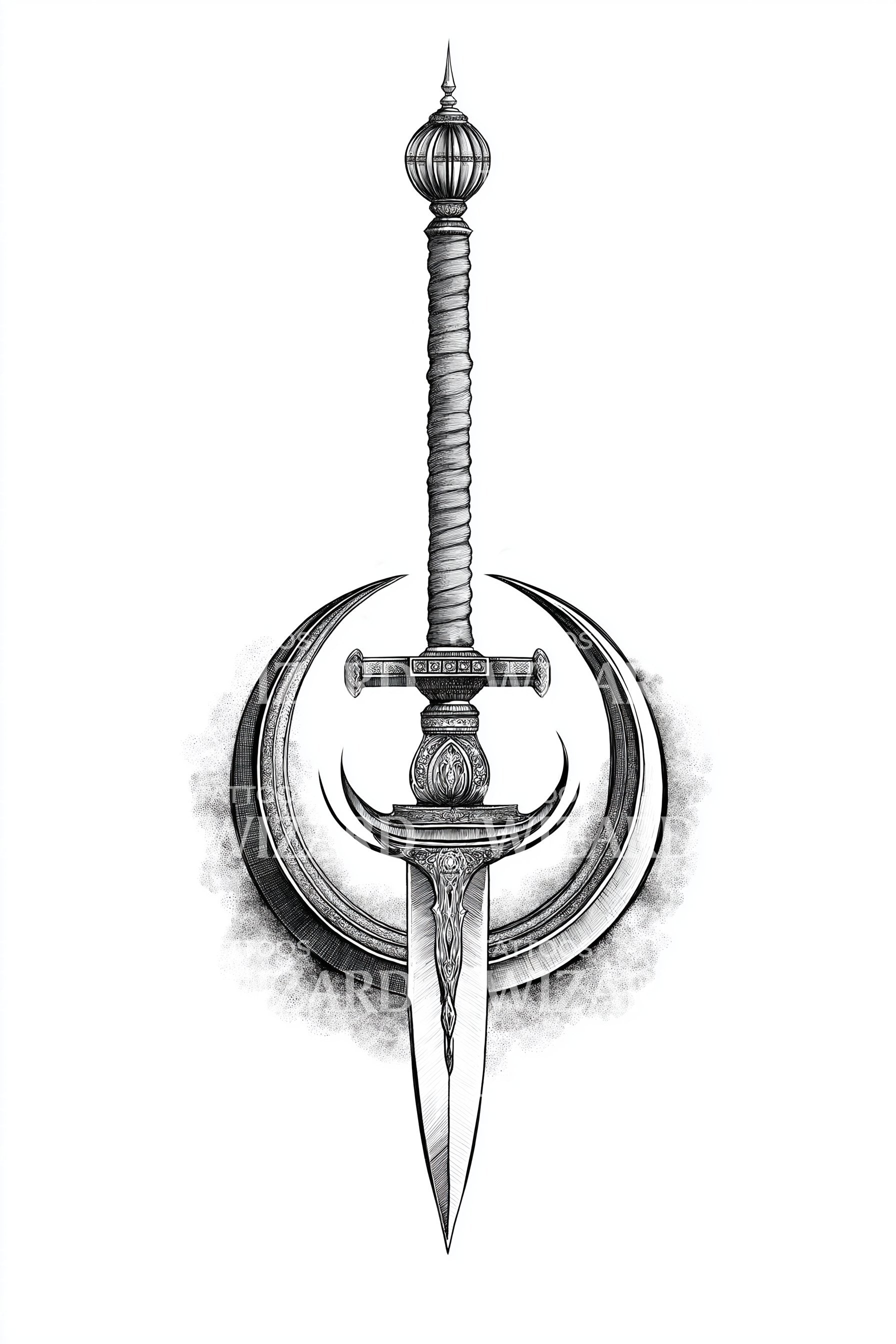 沉浸于这款黑色纹身设计中神秘与力量的壮丽融合。它展示了一把巧妙变形为新月的匕首。刀刃与月亮的完美结合象征着勇气、蜕变与神秘的锋芒——一件刻画在天体弧线上的武器。