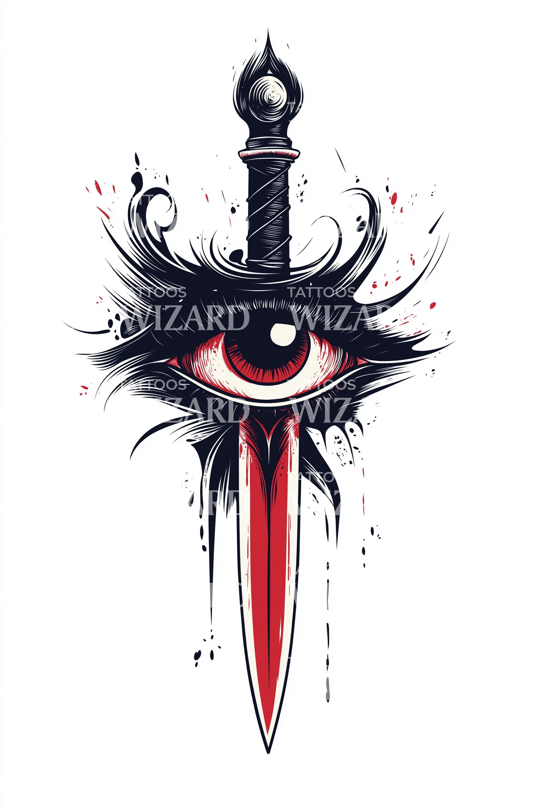 这款戏剧性的黑色纹身设计以一只鲜红的血眼穿透深黑匕首的心脏为特色。鲜明的黑色与鲜艳的红色形成强烈对比,营造出强烈而迷人的美感。对于热爱前卫且深刻象征意义的人来说,这是一个非凡大胆的宣言。