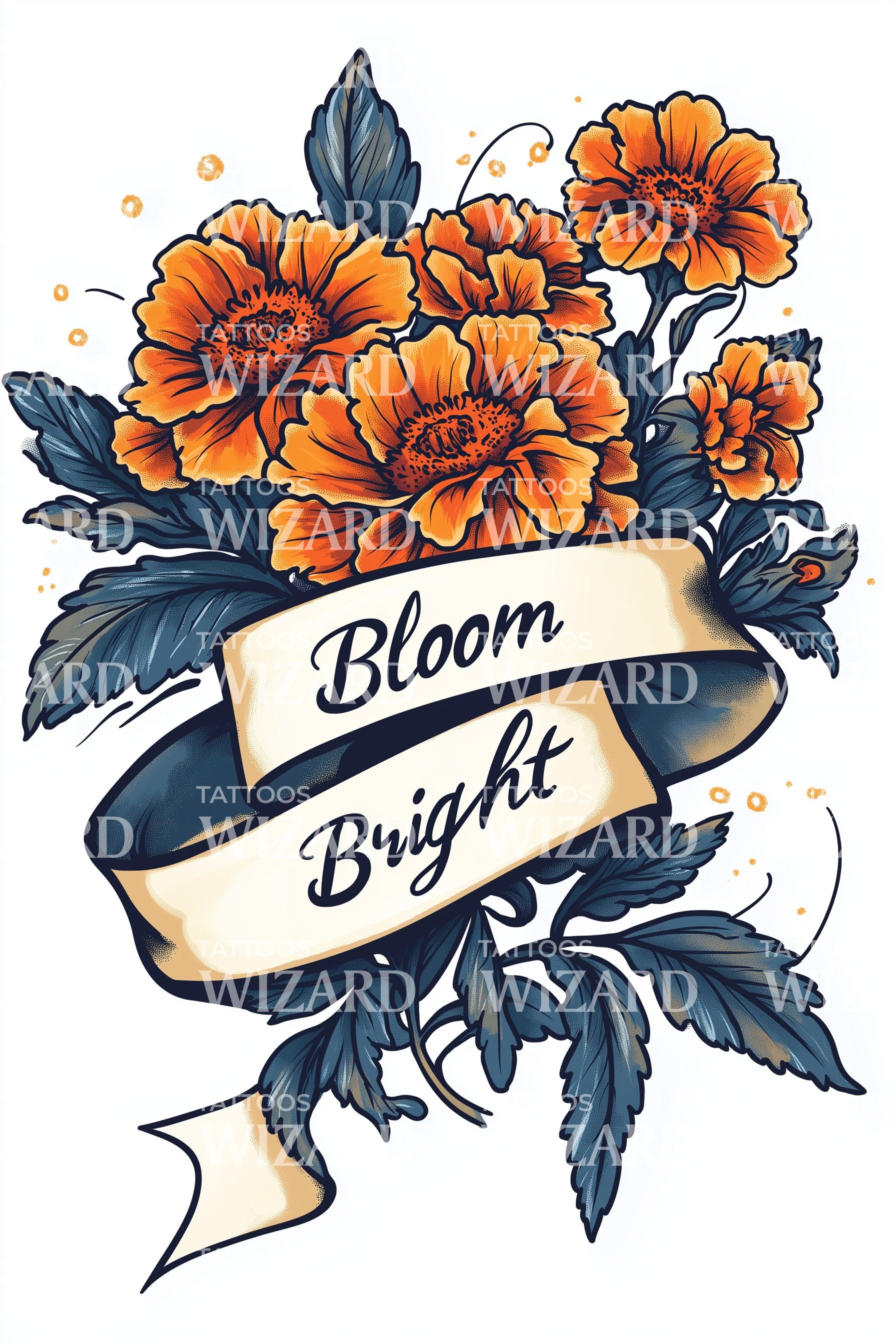 沉浸于这款充满活力的纹身设计所散发的复古魅力,设计中绽放着一朵橙色花朵。这件鲜艳的作品融合了经典的横幅,适合个性化铭文。充满生命力与色彩,它是灵感的无尽源泉。非常适合富有艺术气息的你。