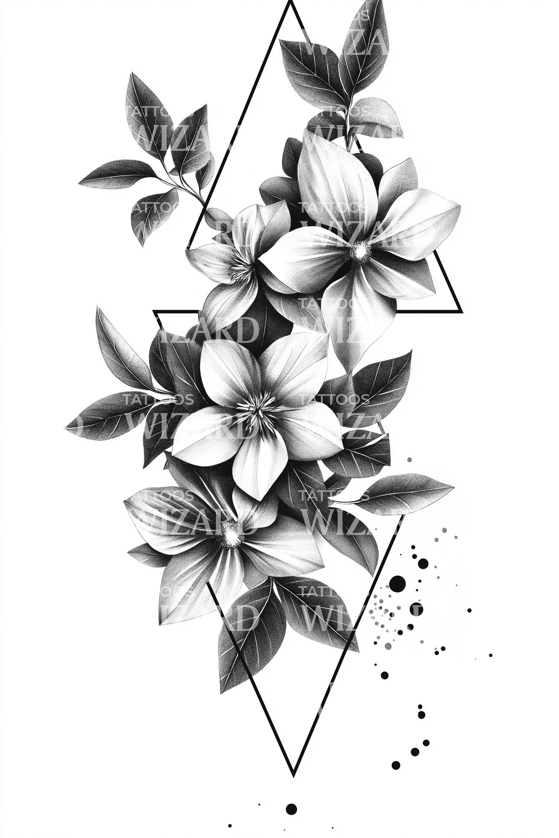 这款精美的黑灰纹身设计展现了一簇令人着迷的茉莉花盛开。丰富的花卉和植物元素交织融合,带来自然优雅的气息。低调却极具美感,设计体现了宁静与坚韧,真实地传达了茉莉花的雄伟本质。
