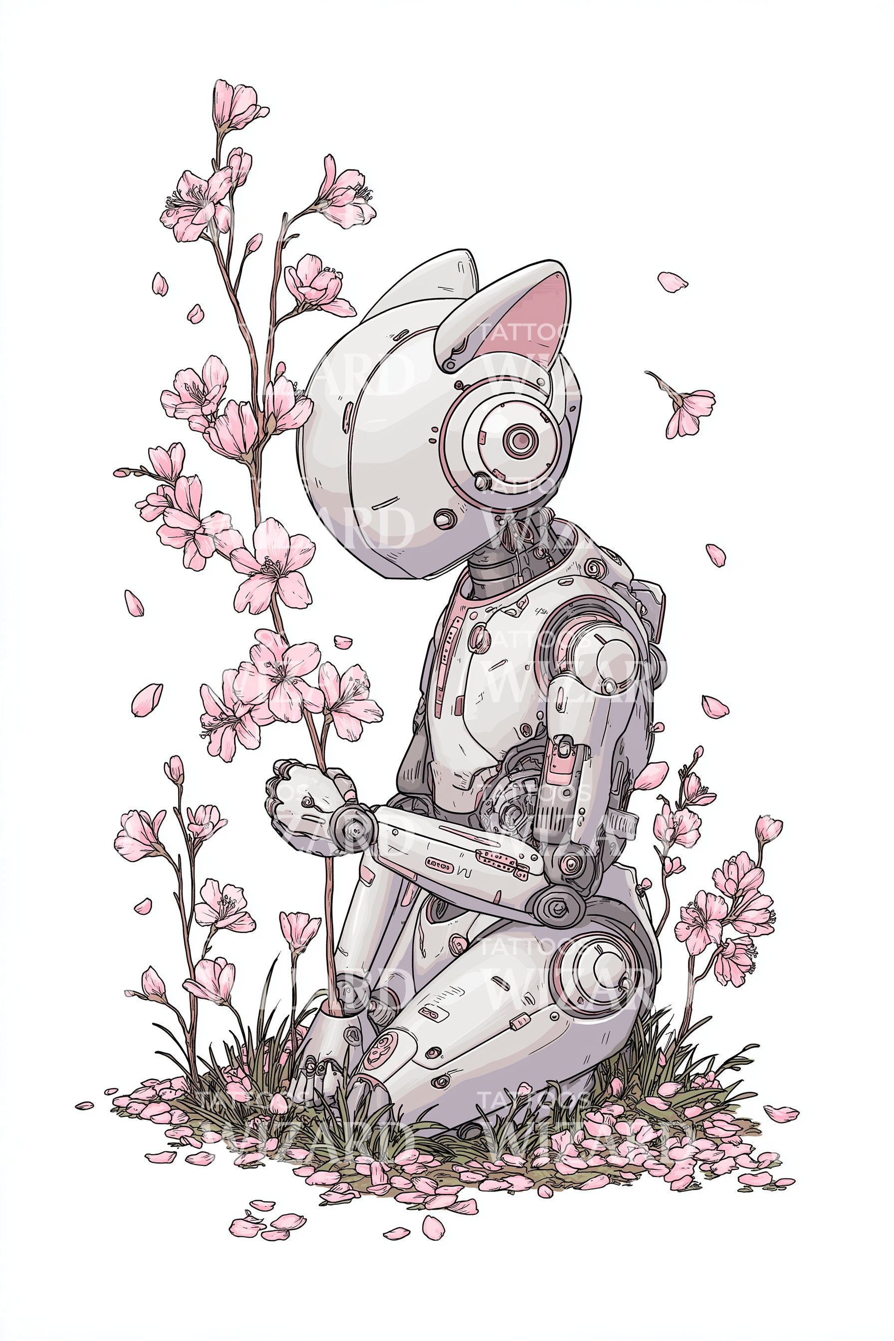 体验我们新传统猫机器人纹身设计中传统与未来主义的独特融合。点缀着樱花与花卉,这件象征性的作品将有机自然与赛博创新完美结合。非常适合欣赏精致细节和体艺术中意想不到元素的您。