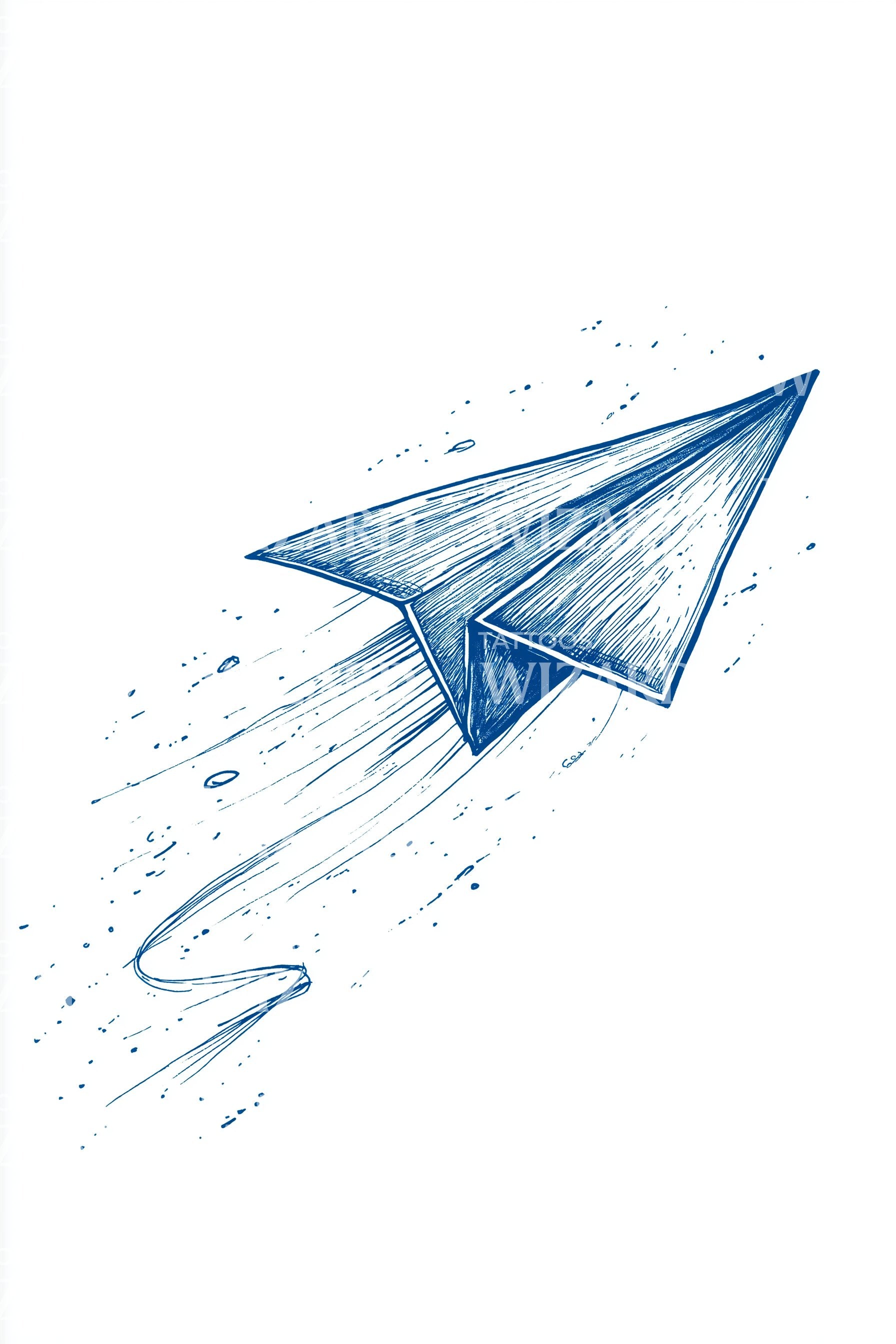 Sky-kissed watercolor lines sketch a blue paper plane, ink-splashed and swift, its trail sweeping forward. Symbol of playful beginnings and brave departures, it honors curiosity, letters unsent, flights ahead. Feels airy, hopeful, quietly daring. Best on forearm for momentum, ribcage for glide, calf for ascent, collarbone for lift.