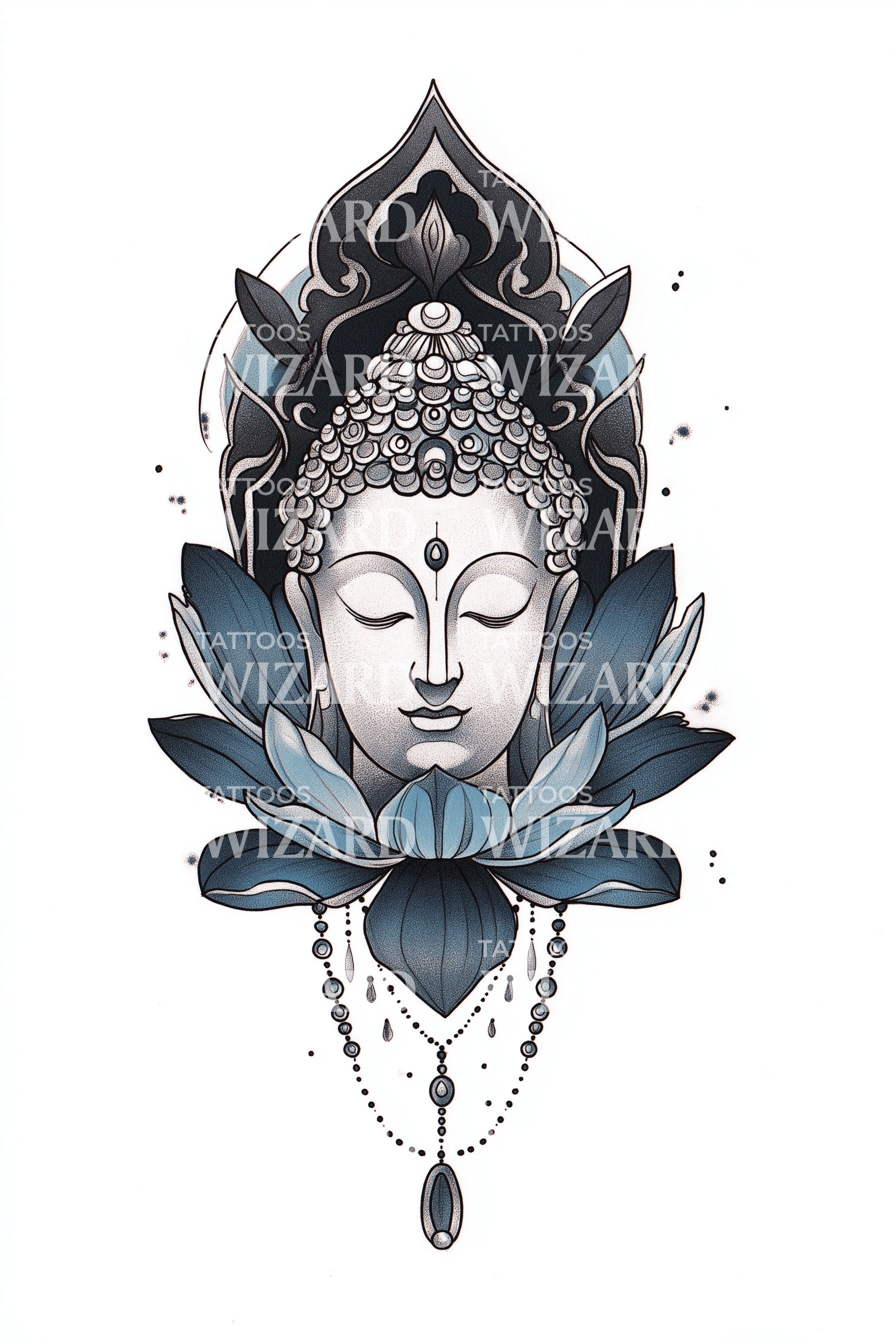 沉浸于这款日本佛陀纹身设计的宁静祥和之中。设计以宁静的蓝色调点缀,展现一尊安详的佛陀静坐于莲花丛中,散发出宁静与安详的气息,同时捕捉了传统日本艺术的精髓。