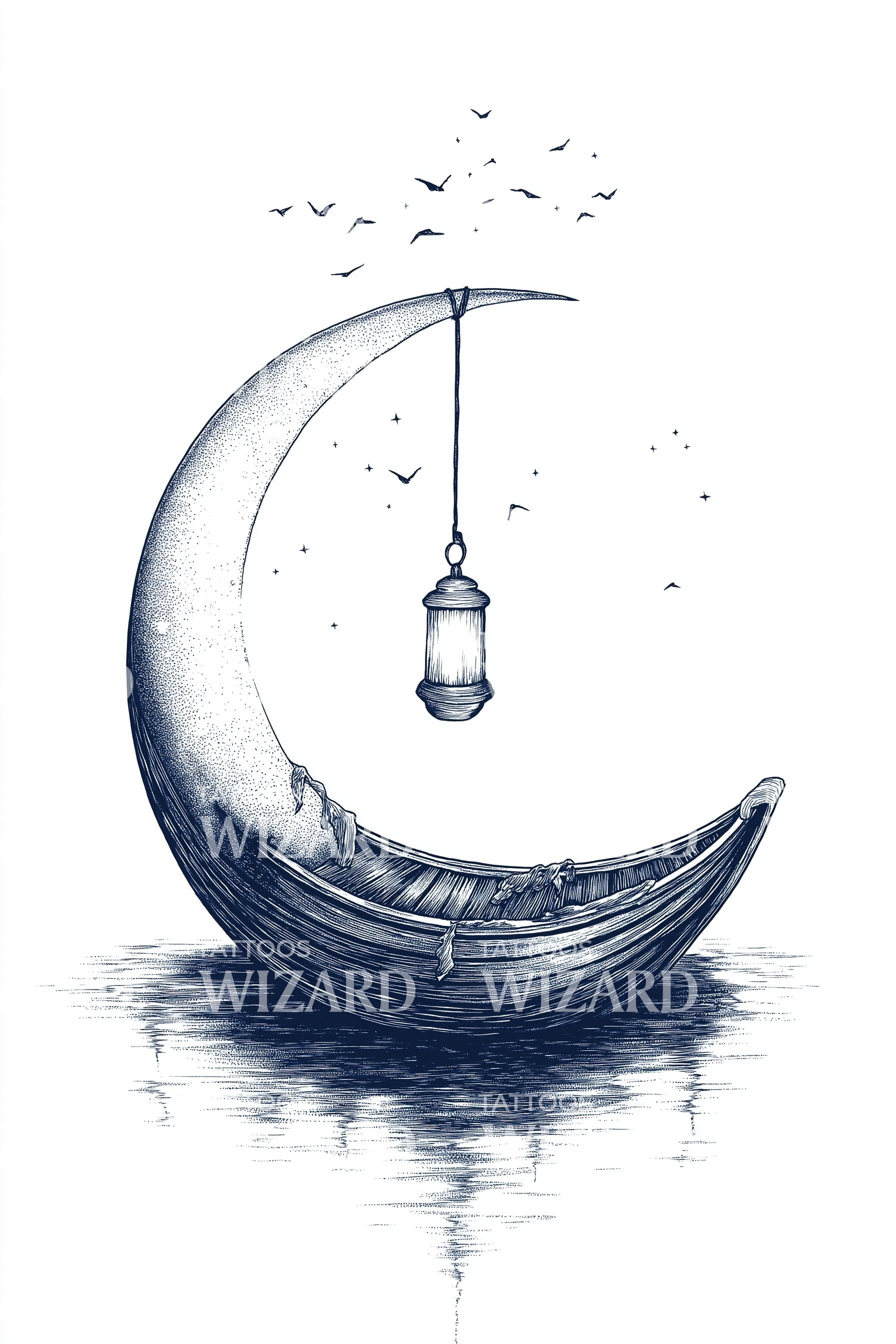 水彩蓝色描绘出一轮新月,如同一艘风化的小船,微小的灯笼在倒映的海面上摇曳。象征指引、安全通行和在黑暗中航行的梦想。佩戴如同平静的勇气。非常适合前臂或小腿的垂直流线,脊柱的提升感,或肋骨处的曲线环抱。