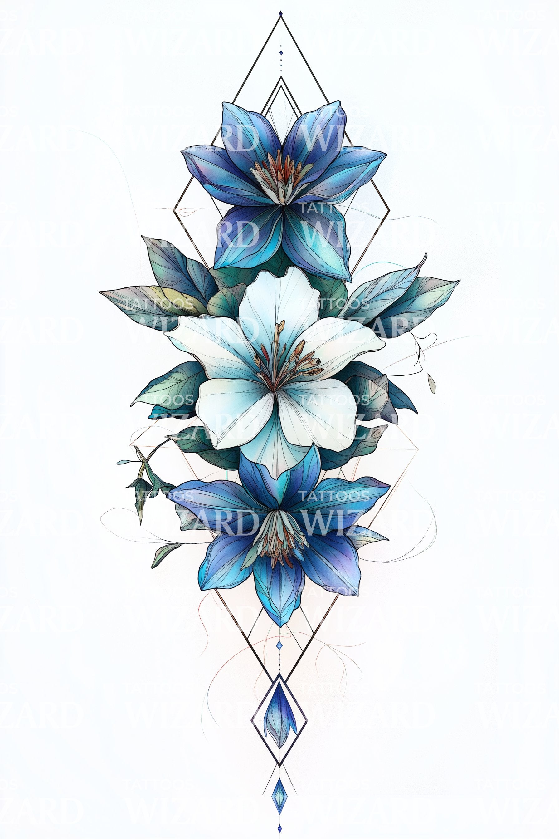 探索这款充满活力的水彩纹身设计,展现独特的艺术融合。它巧妙地结合了几何图案,呈现出一个被花朵包裹的惊艳蓝色钻石。鲜艳的色彩营造出迷人的美感,是欣赏动态水彩优雅的纹身爱好者的非凡之选。