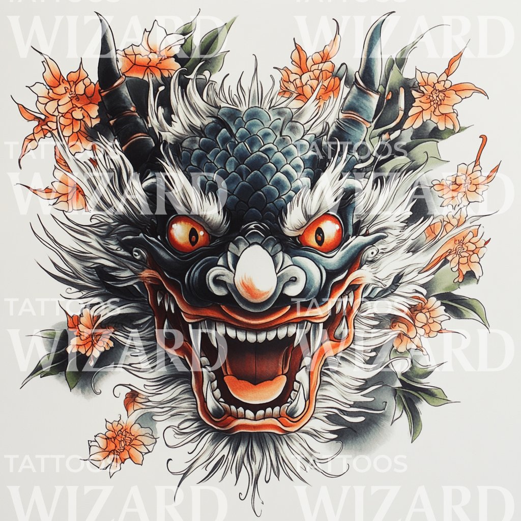 深入探索日本的神秘世界,欣赏这款令人惊叹的纹身设计。它展现了一条雄伟的龙与神秘的妖怪交织在一起,周围环绕着蓝色和橙色的花朵,这件作品捕捉了日本民间传说的丰富象征意义。用这件永恒的艺术作品装点你的肌肤。