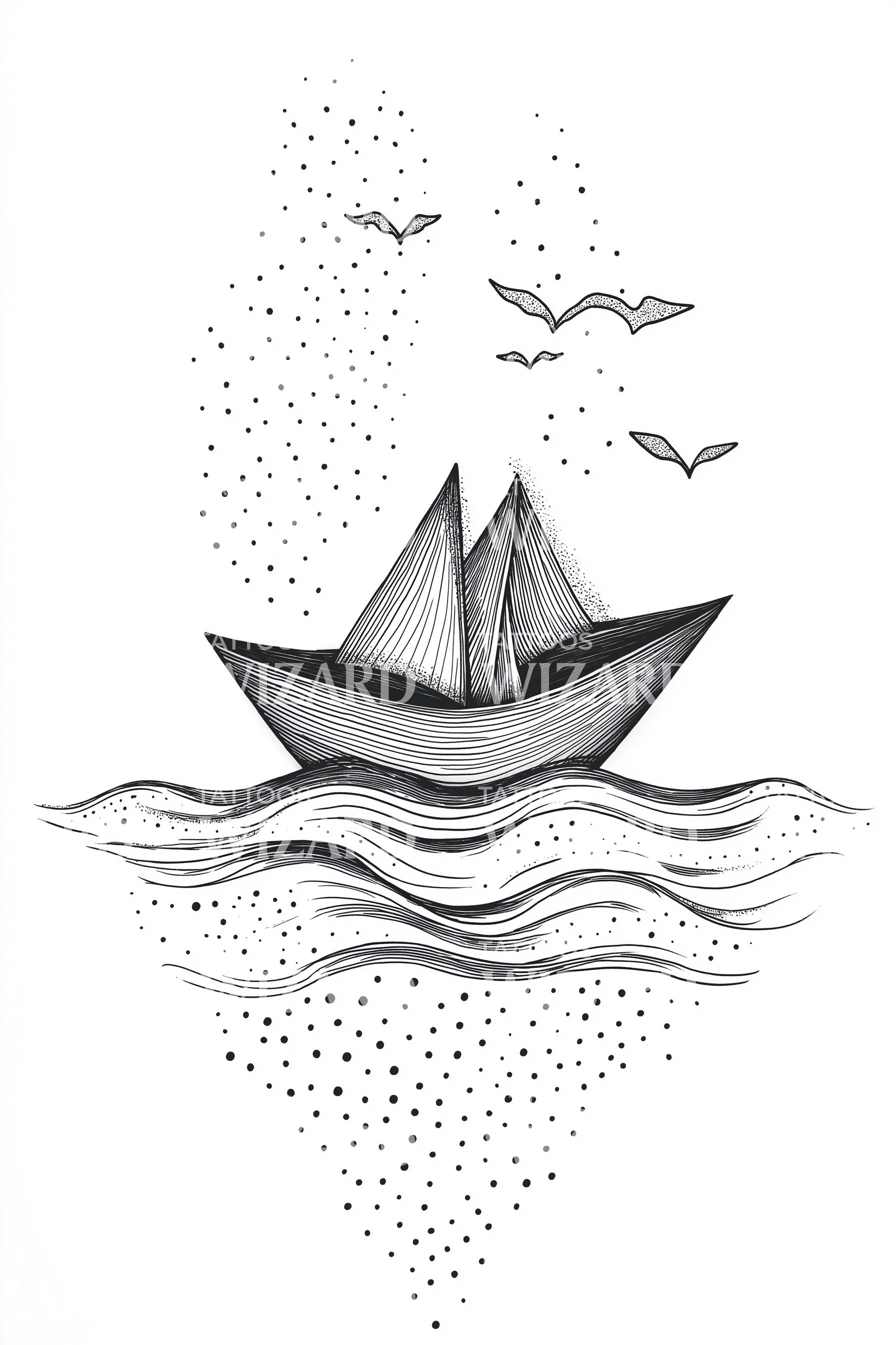 细腻的点线勾勒出一只折叠的纸船,乘风破浪,伴随着鸟儿穿越漂浮的星座。象征着勇敢的旅程与自由,传递出宁静的决心与开阔的视野。非常适合纹在前臂、脊柱、小腿或肋骨处,顺着垂直的线条流动,呼吸,引导。