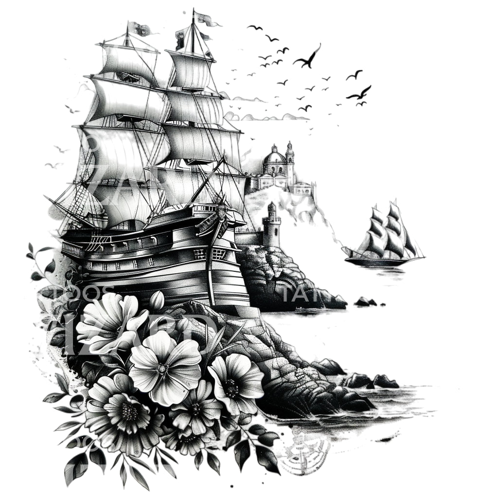 体验葡萄牙探索的精髓,这款引人注目的黑灰色卡拉维拉纹身设计。细致入微,结合了历史帆船和精美花卉的图像,描绘了葡萄牙发现之旅的丰富历程。由著名纹身艺术家约翰创作,它是勇敢水手的视觉载体。
