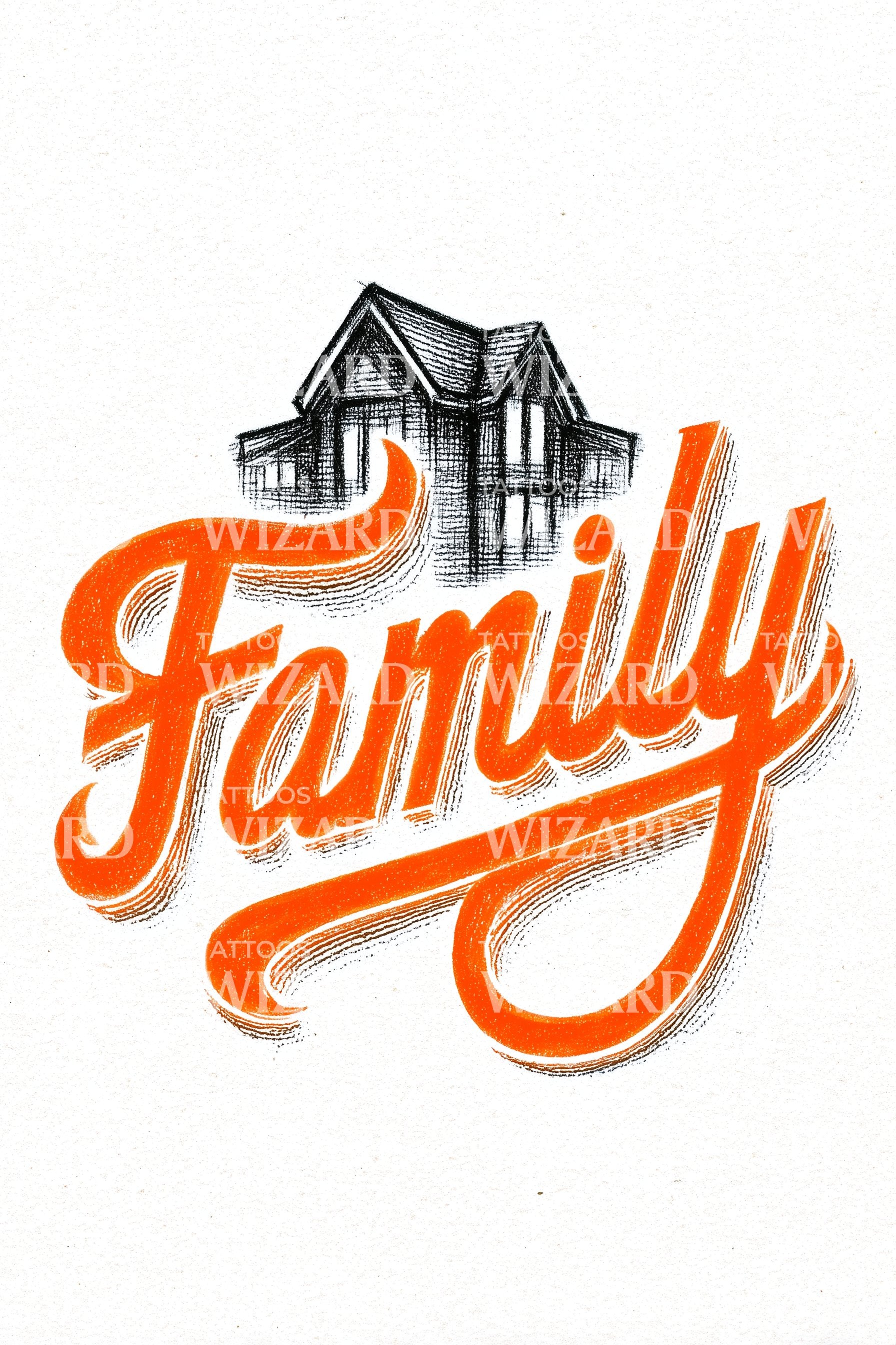 Bold tangerine script flows into Family, newschool and electric, with a charcoal house perched above. Hand-brushed lines glow like porch lights, turning lettering into a shelter. Symbol of roots and devotion, this design radiates warmth and courage, a bright vow to protect home through every season and storm.