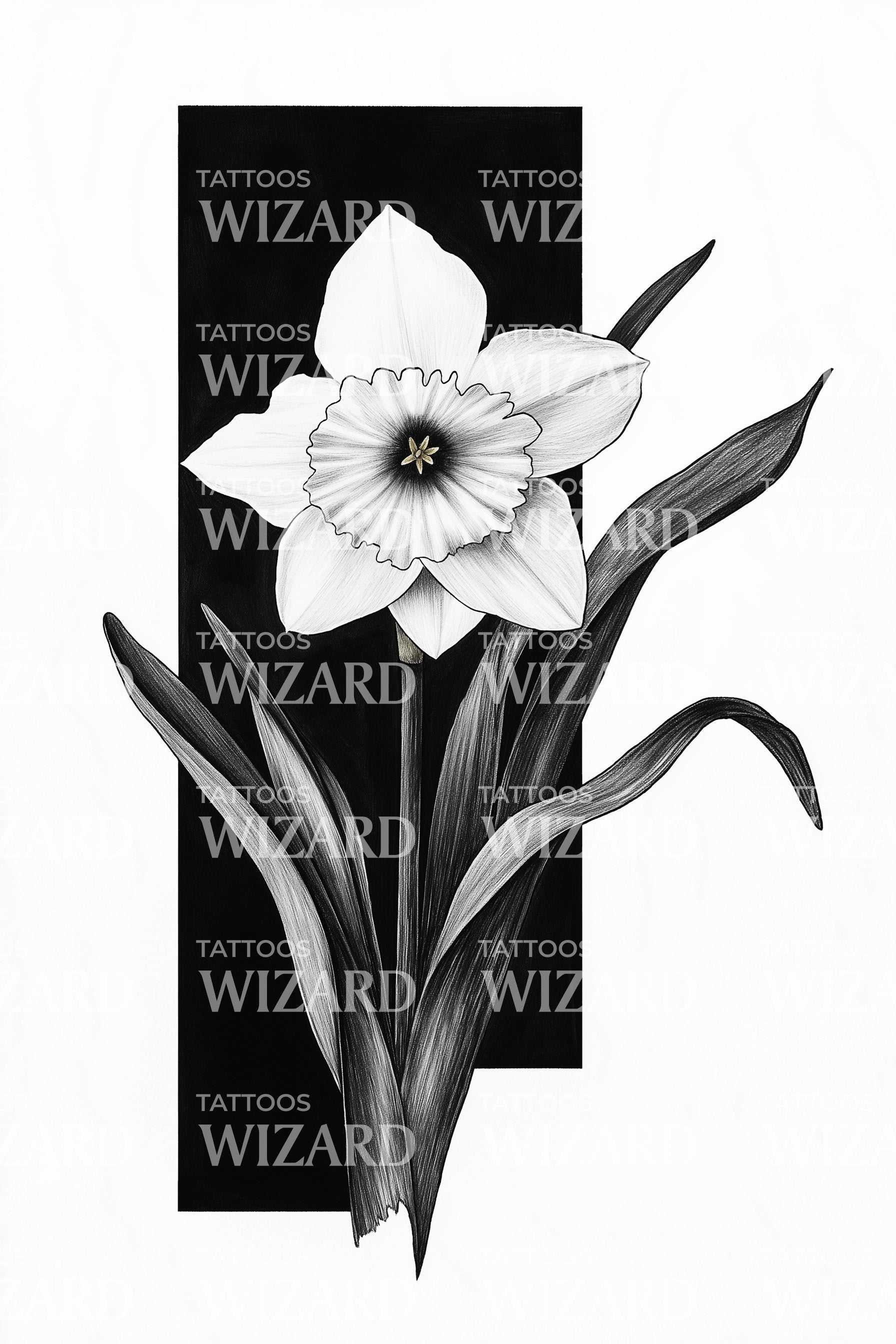 以这款黑色纹身设计大胆表达自然之美。它巧妙融合了图形与分格元素,生动细致地描绘出一朵水仙花。花朵优雅摇曳,象征着水仙花丰富的复杂性与坚韧不拔,成为你永恒的重生与新生象征。