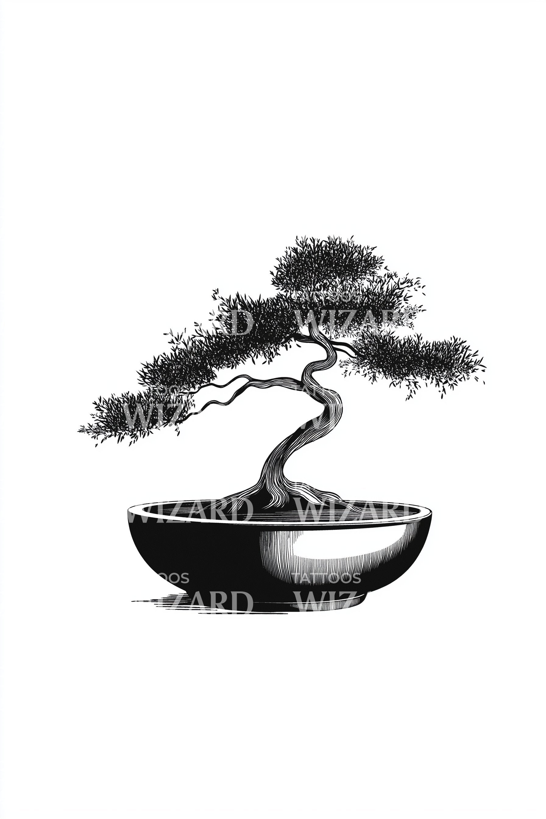 平衡的单色盆景从浅碗中伸展出弧线,蜿蜒的树干和轻盈的叶子以宁静的线条描绘。象征着耐心、成长与自然的和谐,为生活带来禅意的宁静。理想的纹身位置:内前臂展现流动感,肋骨体现轮廓,小腿或脚踝展现优雅,上背部传达静谧。
