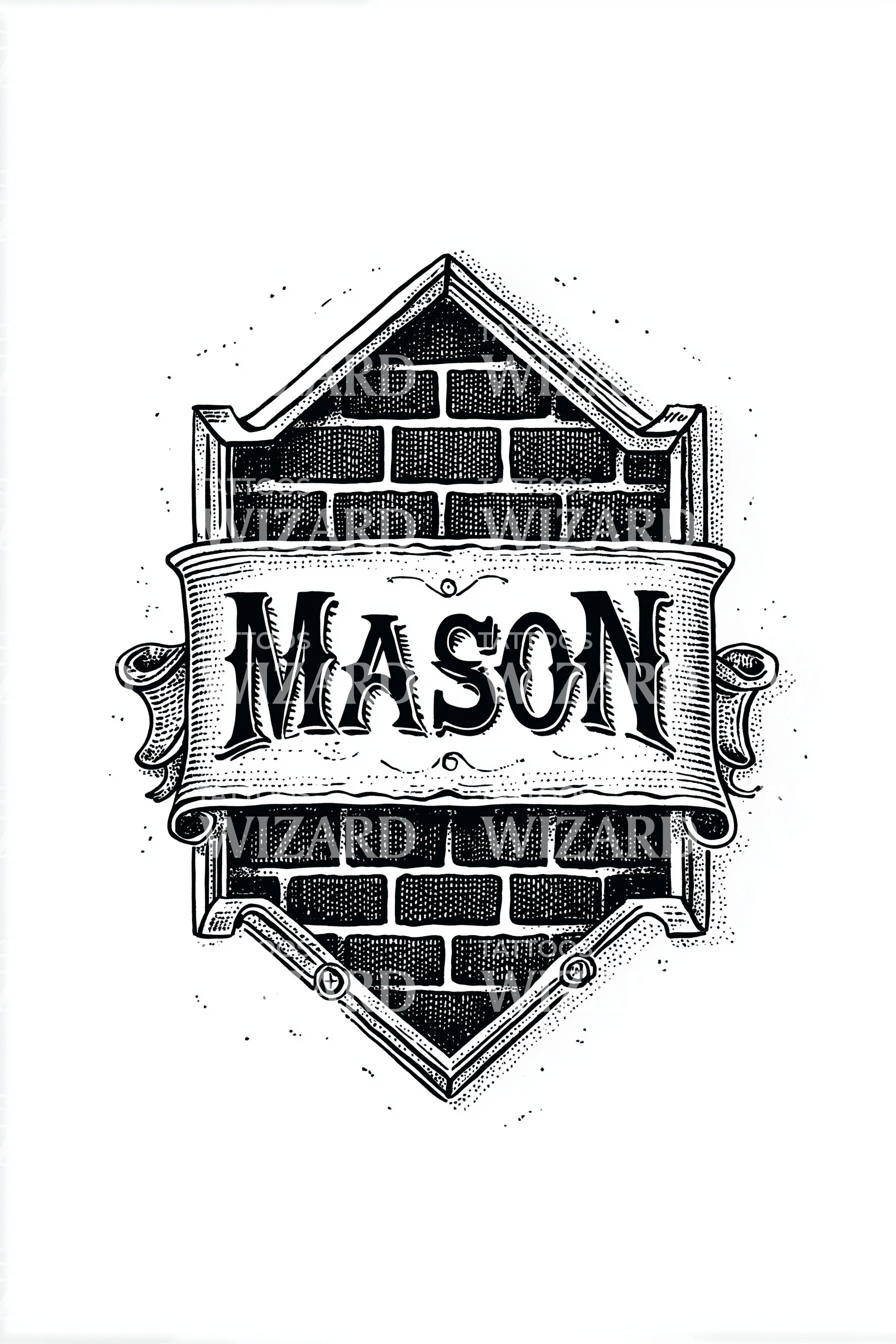 Geometric shield frames a brickwork field, rendered in crisp linework and subtle stipple. A scroll badge carries the name MASON in bold, industrial lettering. Symbolizing craft, endurance, and protective foundation, this emblem honors builders of legacy. Wear it to feel grounded, steadfast, and proudly hands-on with enduring pride.