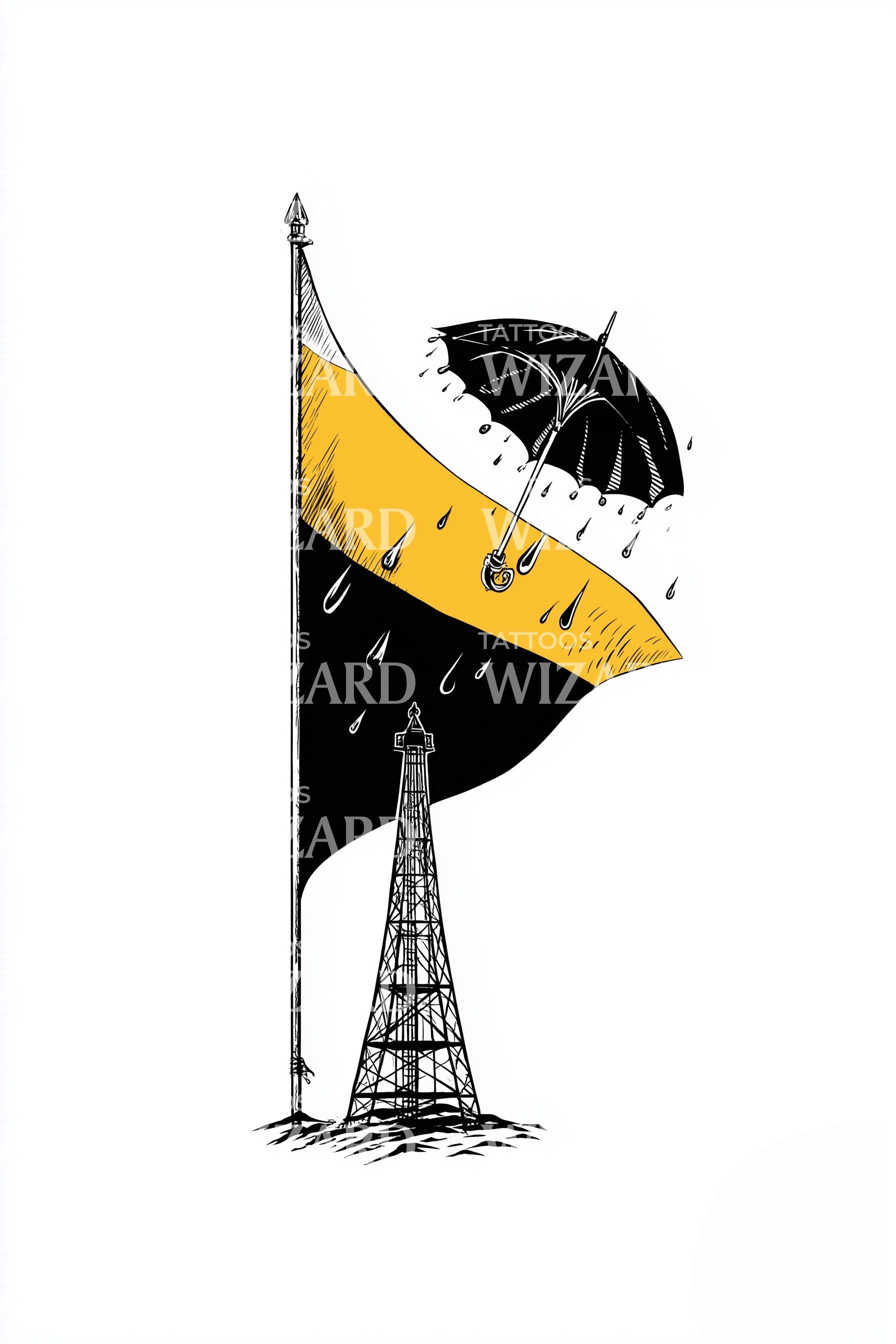 以优雅的素描风格手绘,这款纹身设计致敬文莱的传统。皇家伞盖护着国旗上的新月和双手,周围环绕着流动的亚洲图案。简约线条,丰富象征:保护、尊严与身份。非常适合前臂、肩膀或背部位置。清晰的阴影,永恒的质感。