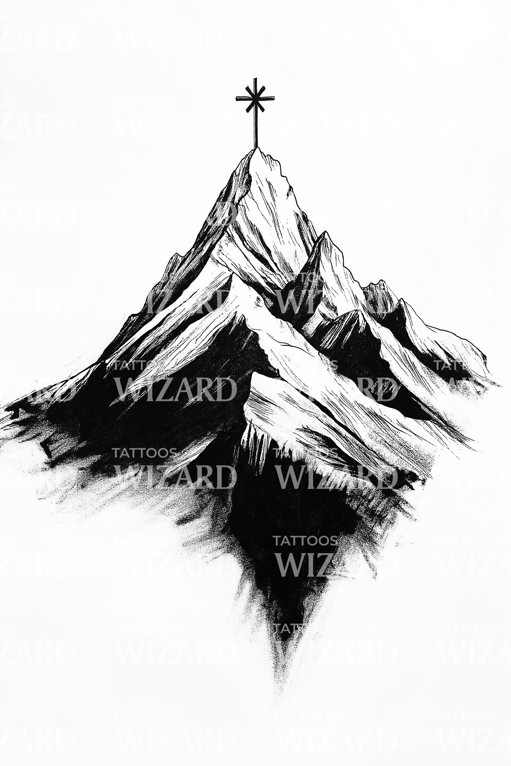 沉浸于大自然的壮丽之中,这款素描风格的纹身设计展现出巍峨的山峰,采用充满动感的笔触精心绘制,融入象征性的十字架。这幅富有表现力的纹身艺术体现了力量、精神和探索精神,是冒险者的完美象征。