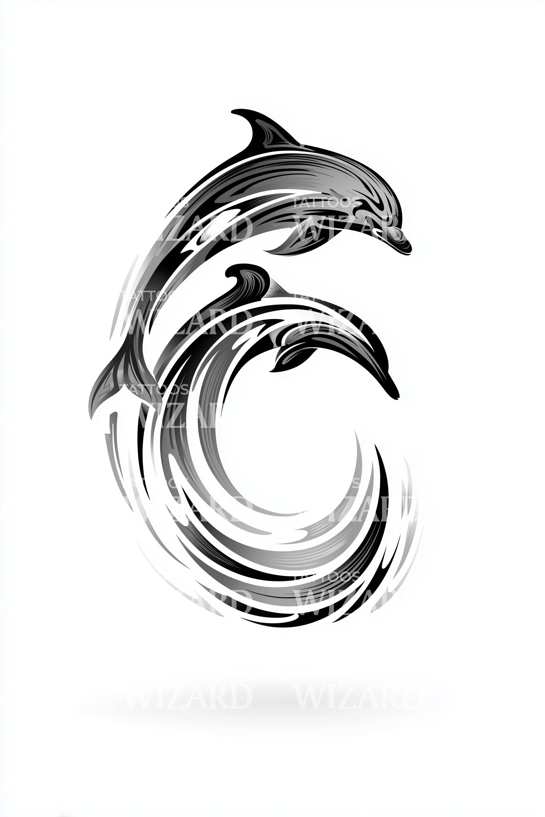 Sleek dolphins arc through a circular brushstroke, their graphite lines forming a minimal whirl of water and light. Two forms move in harmony, symbolizing guidance, play, and the steady flow of life. Worn on skin, this ocean talisman brings calm momentum, quiet joy, and clarity.