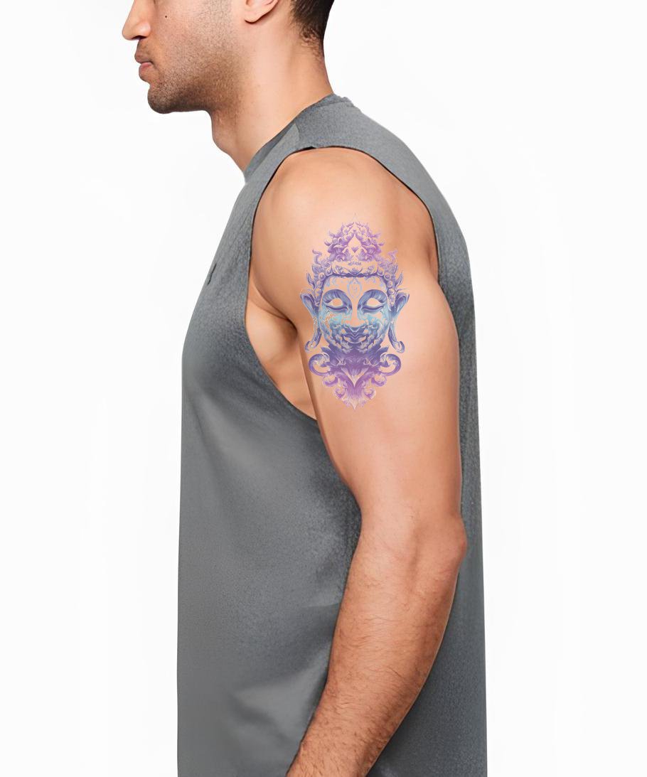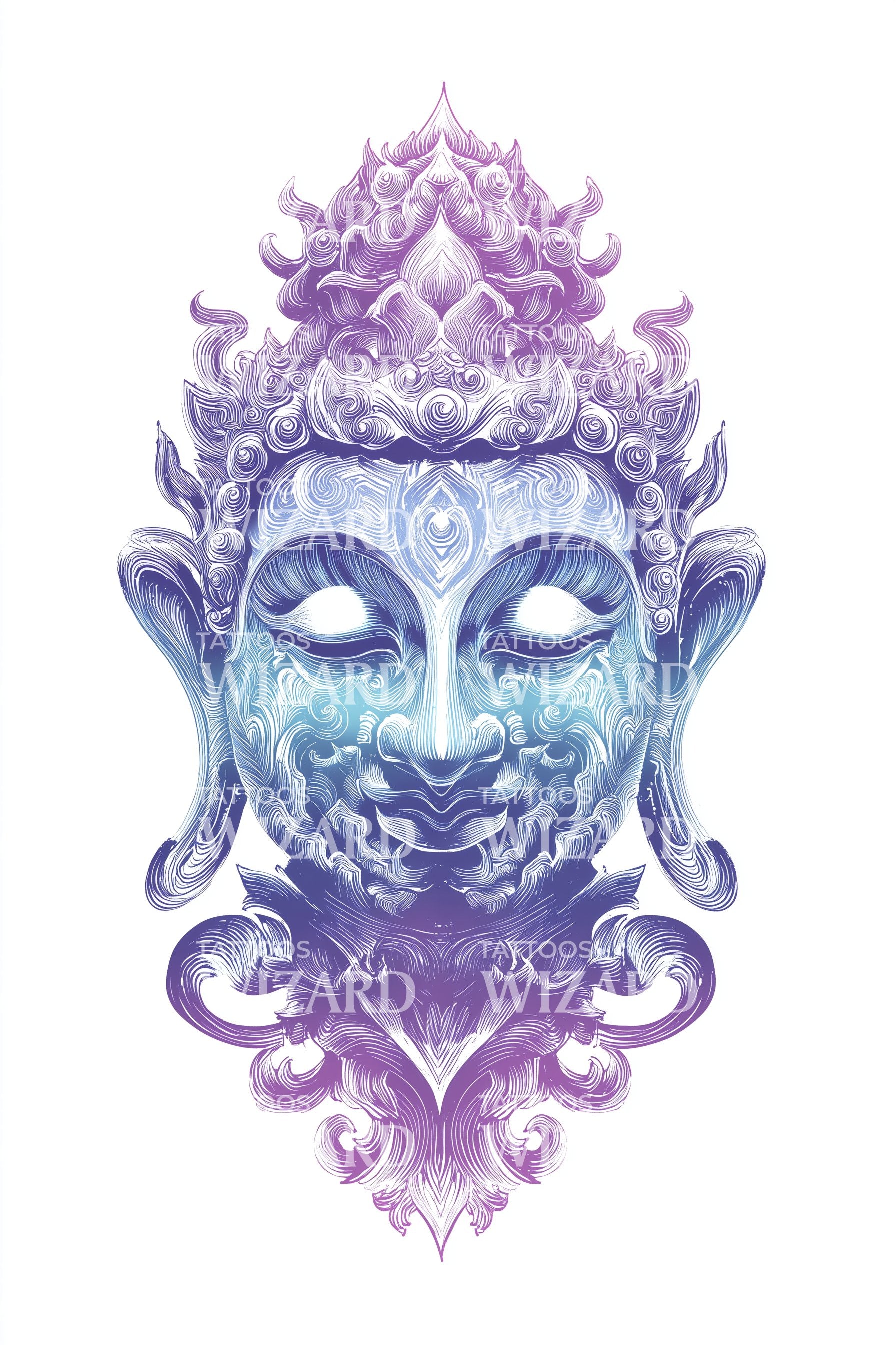 沉浸于宇宙的宁静之中,这款佛陀面具纹身设计充满艺术感。融合禅意智慧与精神宁静,其鲜艳的紫色调唤起一种超凡的神秘感。此设计完美展现内心的平和,映照您灵性的旅程于肌肤之上。