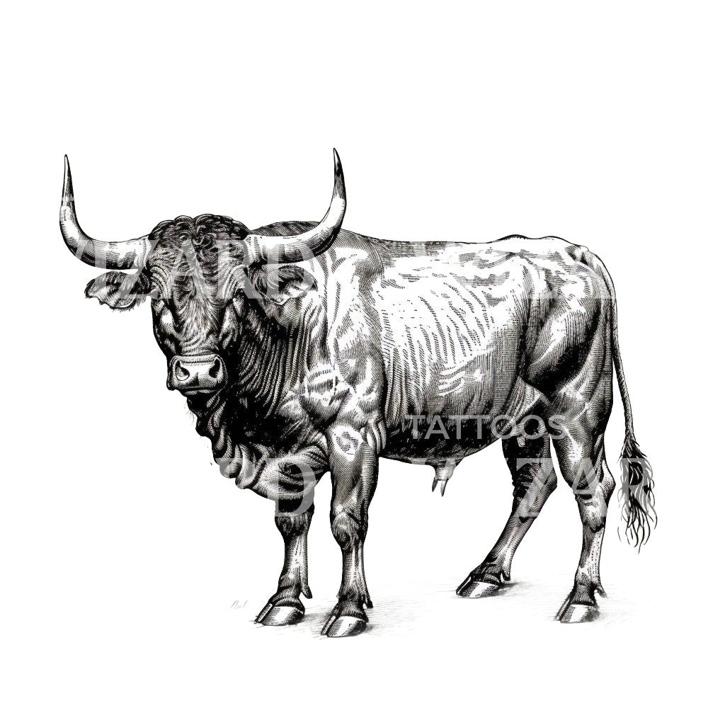 这个黑灰色的纹身设计展示了一幅令人印象深刻的公牛素描,散发出力量和韧性。细致的墨水勾勒出每一个复杂的细节,使作品具有大胆而迷人的魅力。非常适合那些欣赏深具象征意义和前卫身体艺术的人。