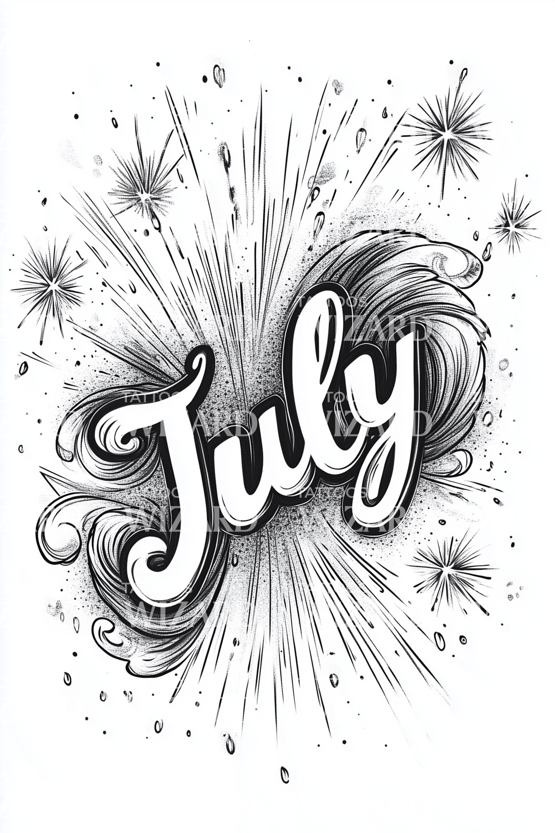 Explosive blackwork lettering crowns July, framed by starburst fireworks, stippled spray, and sweeping ink waves. Each spark marks celebration, courage, and the heat of new beginnings. Worn on skin, this piece radiates kinetic energy, urging spontaneous joy and fearless momentum for anyone who carries summer as a heartbeat.