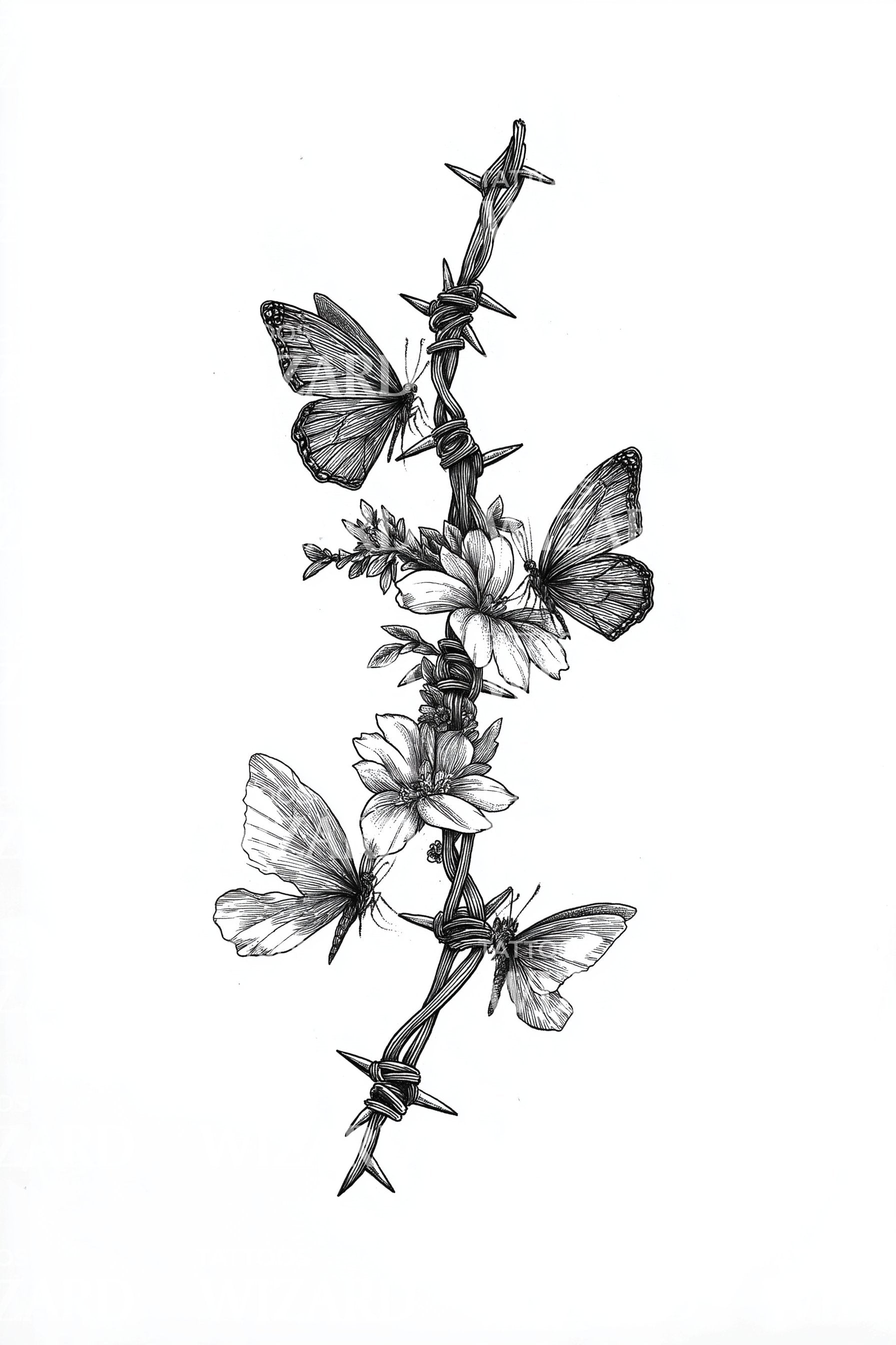 拥抱大自然的奇迹,这款精致的细线纹身设计,细腻地展现了一只蝴蝶栖息在花草丛中的枝头。它是蜕变的惊艳写照,精巧的细节体现了自然界短暂而美丽的瞬间。非常适合追求低调优雅与宁静的你。