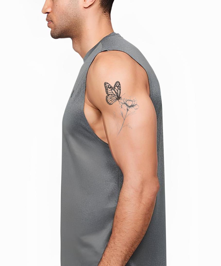 感受这款蝴蝶与康乃馨纹身设计的细腻魅力。精致的线条勾勒出这两种元素转瞬即逝的美丽。此设计将昆虫的优雅与花朵的静谧力量交织在一起,是对大自然纯粹形态的赞美。