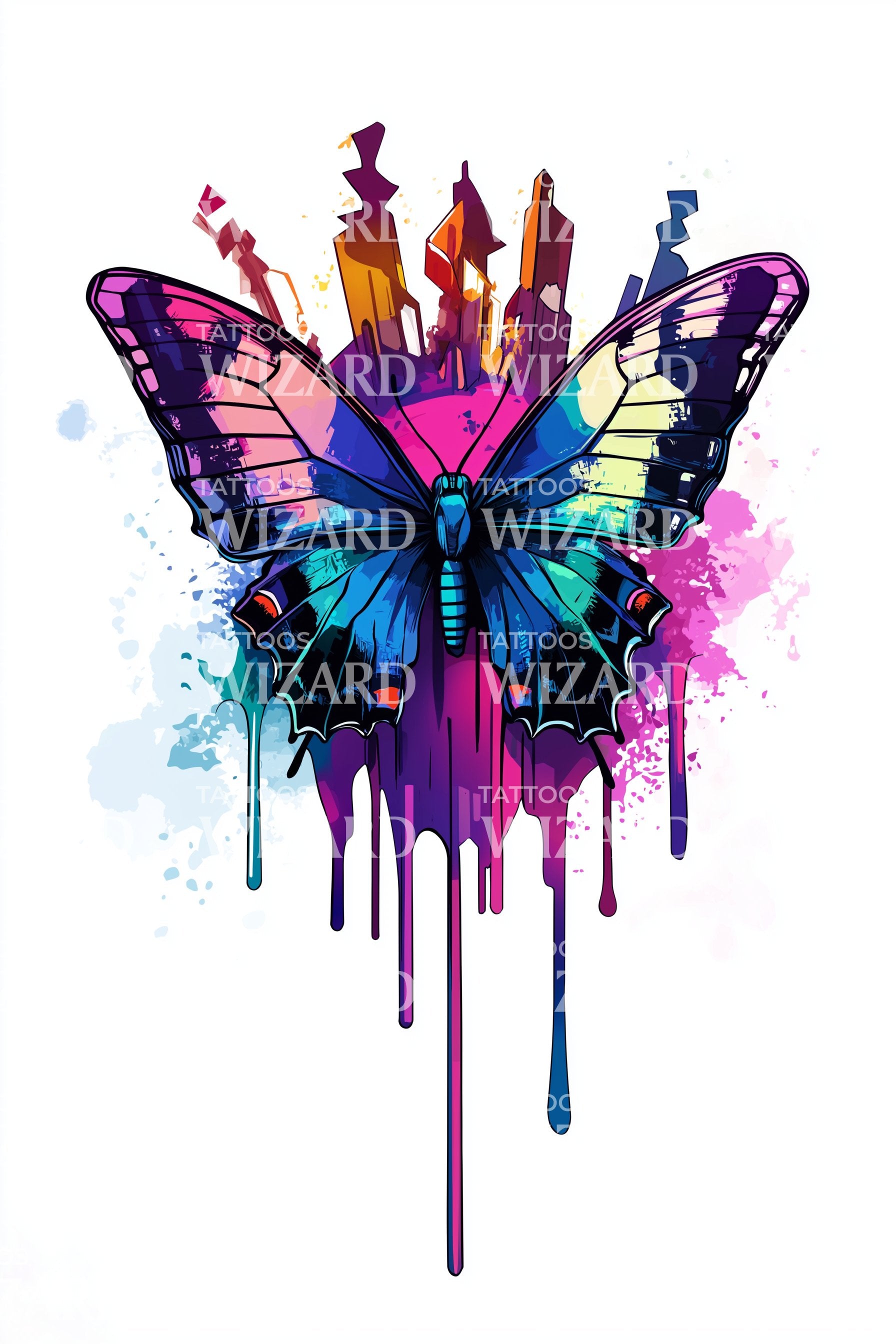 Vivid watercolor wings flare with neon gradients, bursting from abstract citylike shapes, then melting into dreamy drips. The butterfly embodies rebirth and freedom, color translating change into electric courage. Wear it to feel luminous, untamed, and in motion, a personal skyline of possibilities—bold, colorful, endlessly becoming, radiant.
