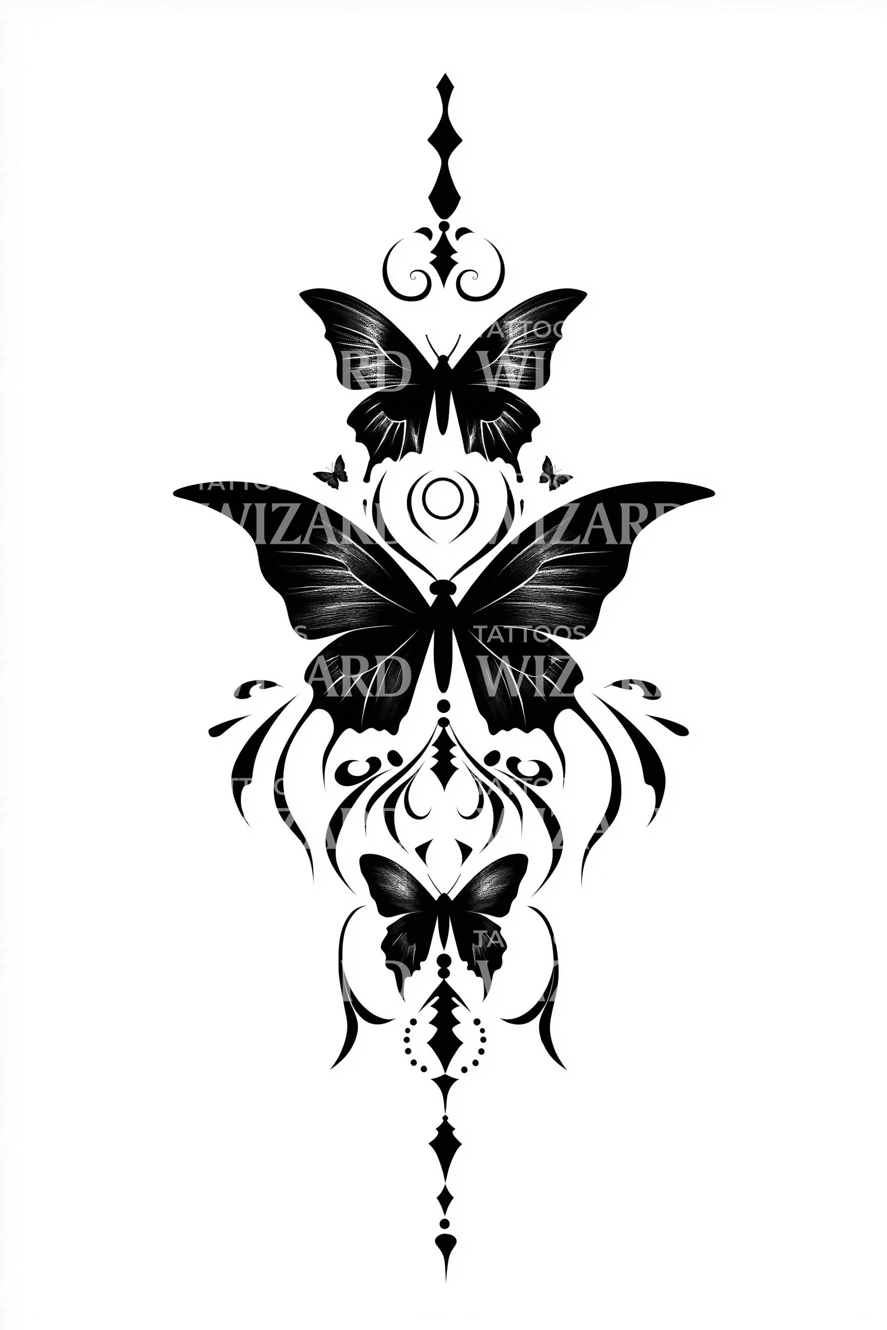 这款装饰性蝴蝶纹身设计轻松展现了魔法与神秘感,其引人入胜的符号和眼睛元素令人着迷。对称的细节完美象征了蜕变,表达了精致与力量的绝妙融合。准备好用这枚魔法徽章来迷倒众人吧。