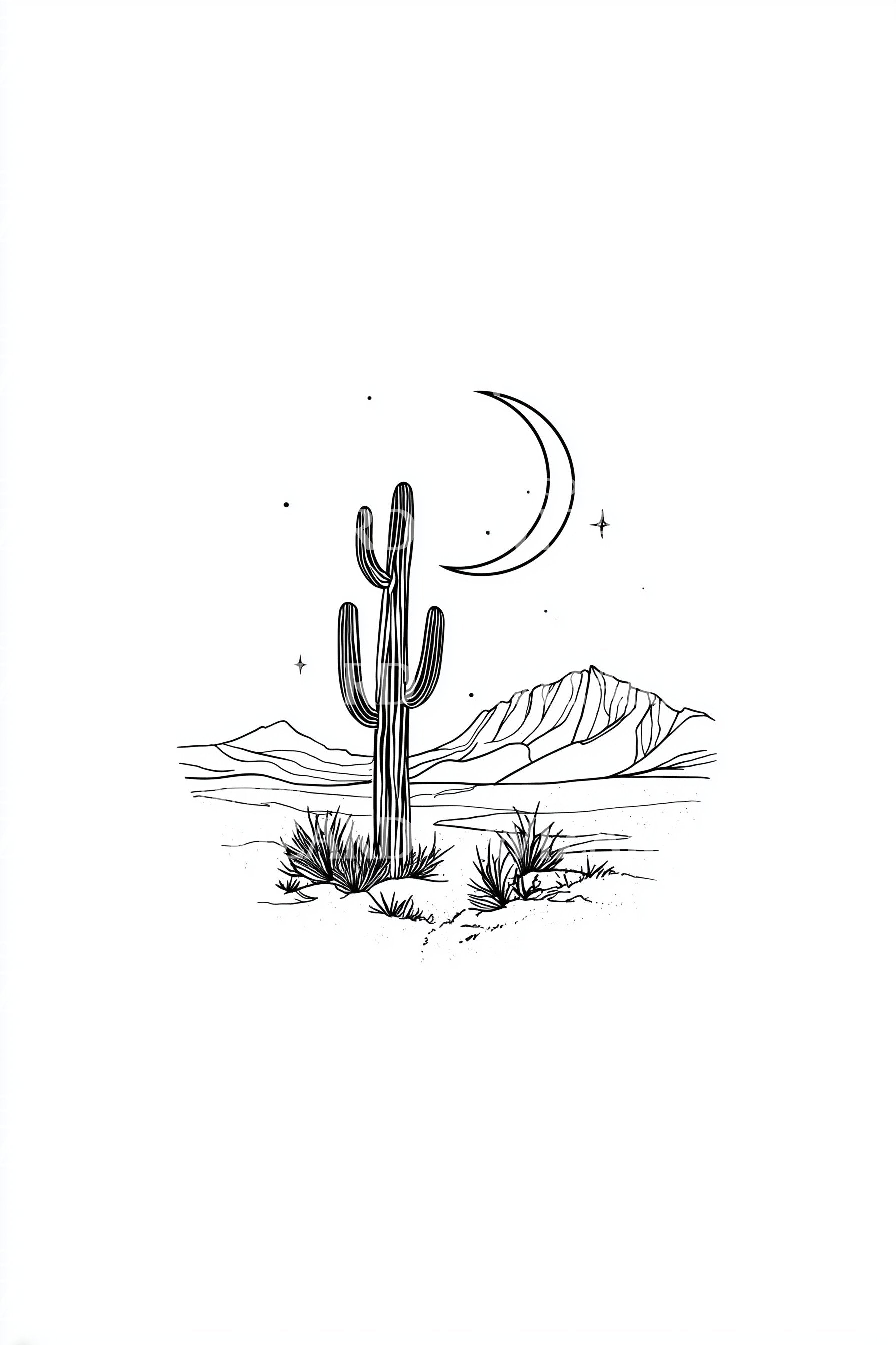 Fineline desert scene where a slender saguaro rises before quiet mountains, under a slim crescent and scattered stars. The cactus speaks of resilience and grounded growth; the moon whispers renewal and cycles. Minimal lines, maximum calm, creating a wearable horizon that steadies the heart and invites night-sky wonder.
