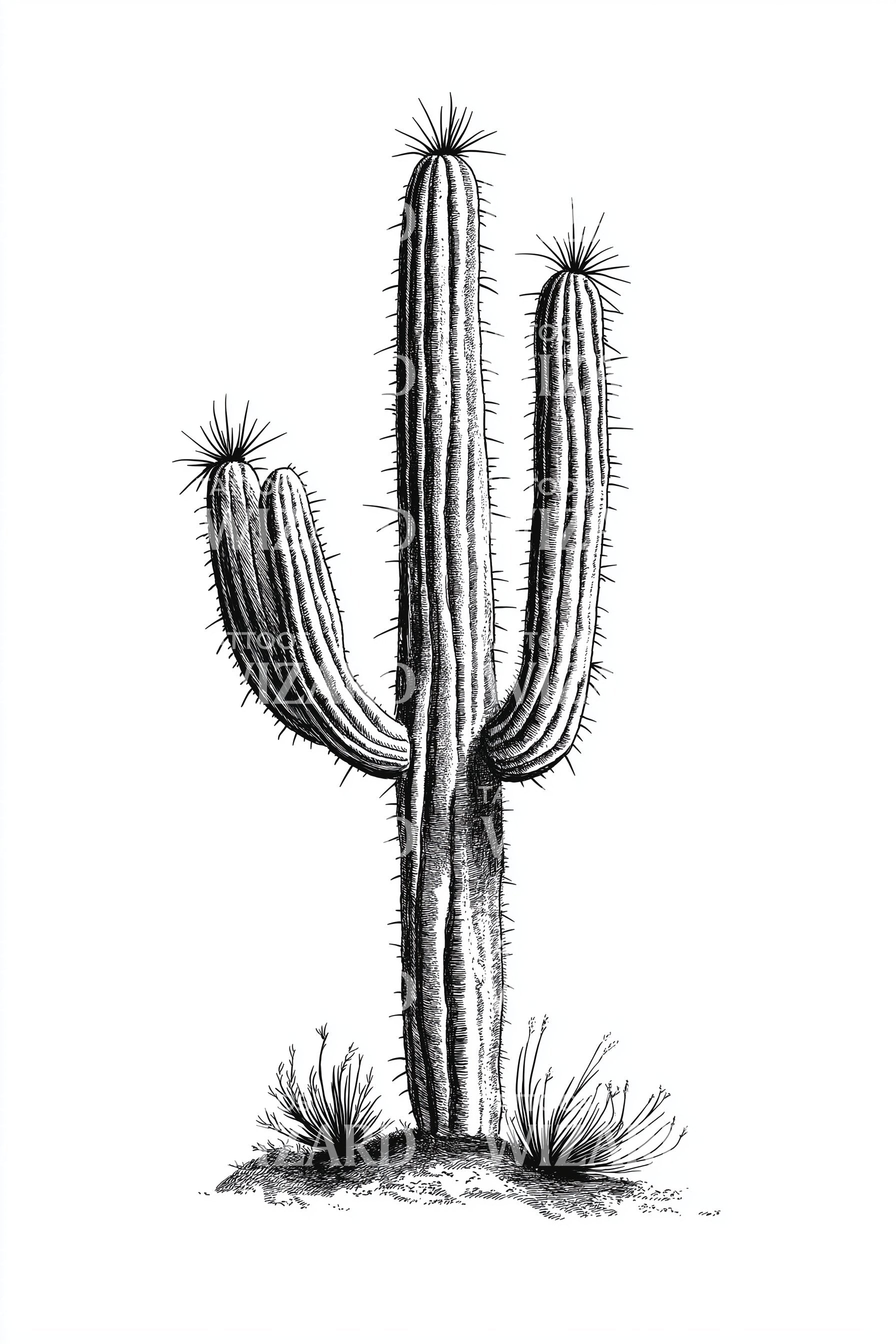Hand-drawn saguaro rises in fine-line sketch, stippled shadows across vertical ribs and bristling spines, rooted in desert grasses. Symbol of resilience and boundaries, it channels Arizona horizons and nature’s calm, gifting courage. Placements: forearm for vertical flow, calf for stride, ribcage side for reach, along spine for columnar grace.