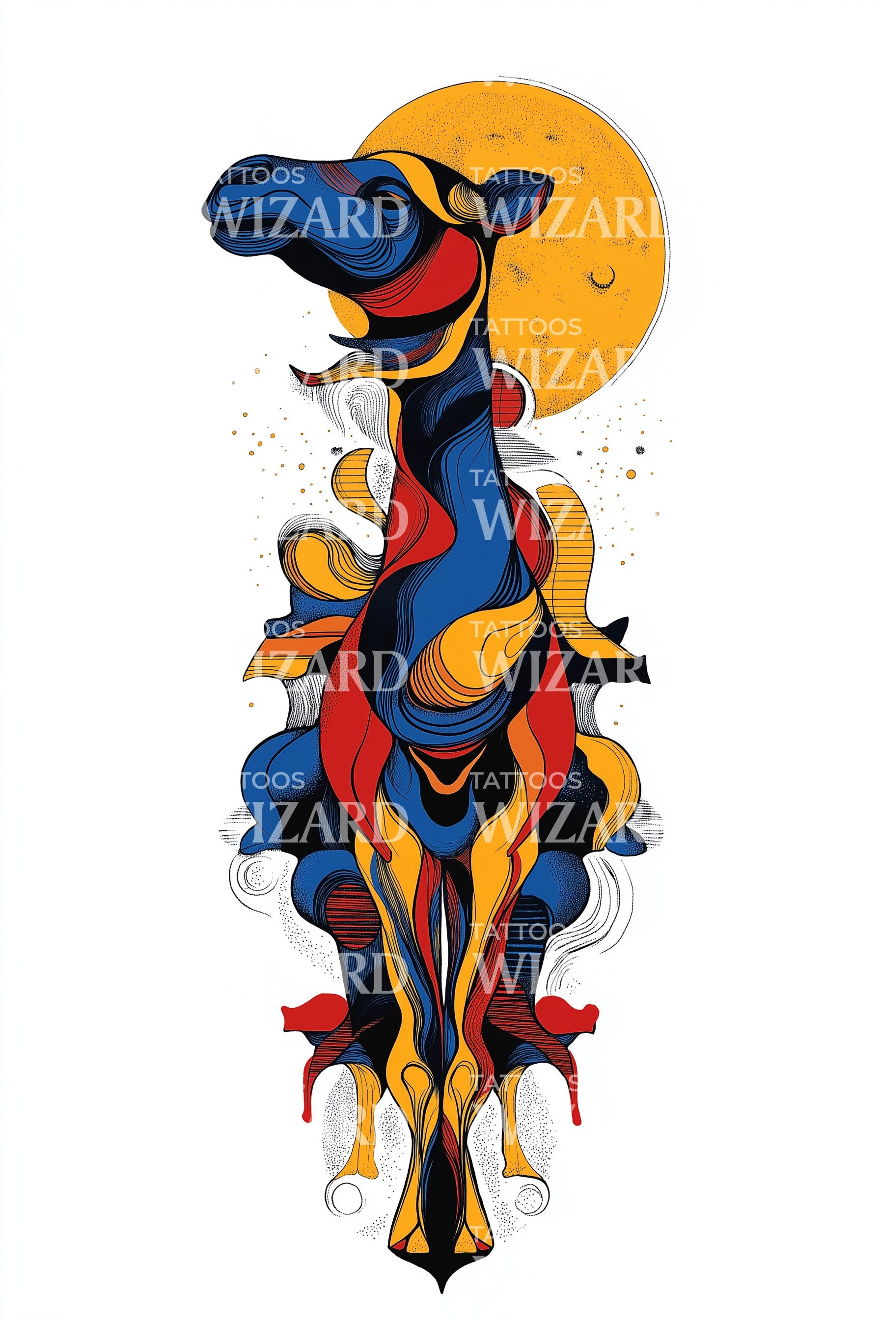 一款现代水彩纹身,捕捉沙漠中的骆驼图腾,融合柔和的晕染与精准的几何点缀。抽象形状呼应沙丘与星座,营造动感与深意。均衡的线条引导视线,半透明的色素在肌肤上闪耀,象征着当代的坚韧、指引与内敛的力量。