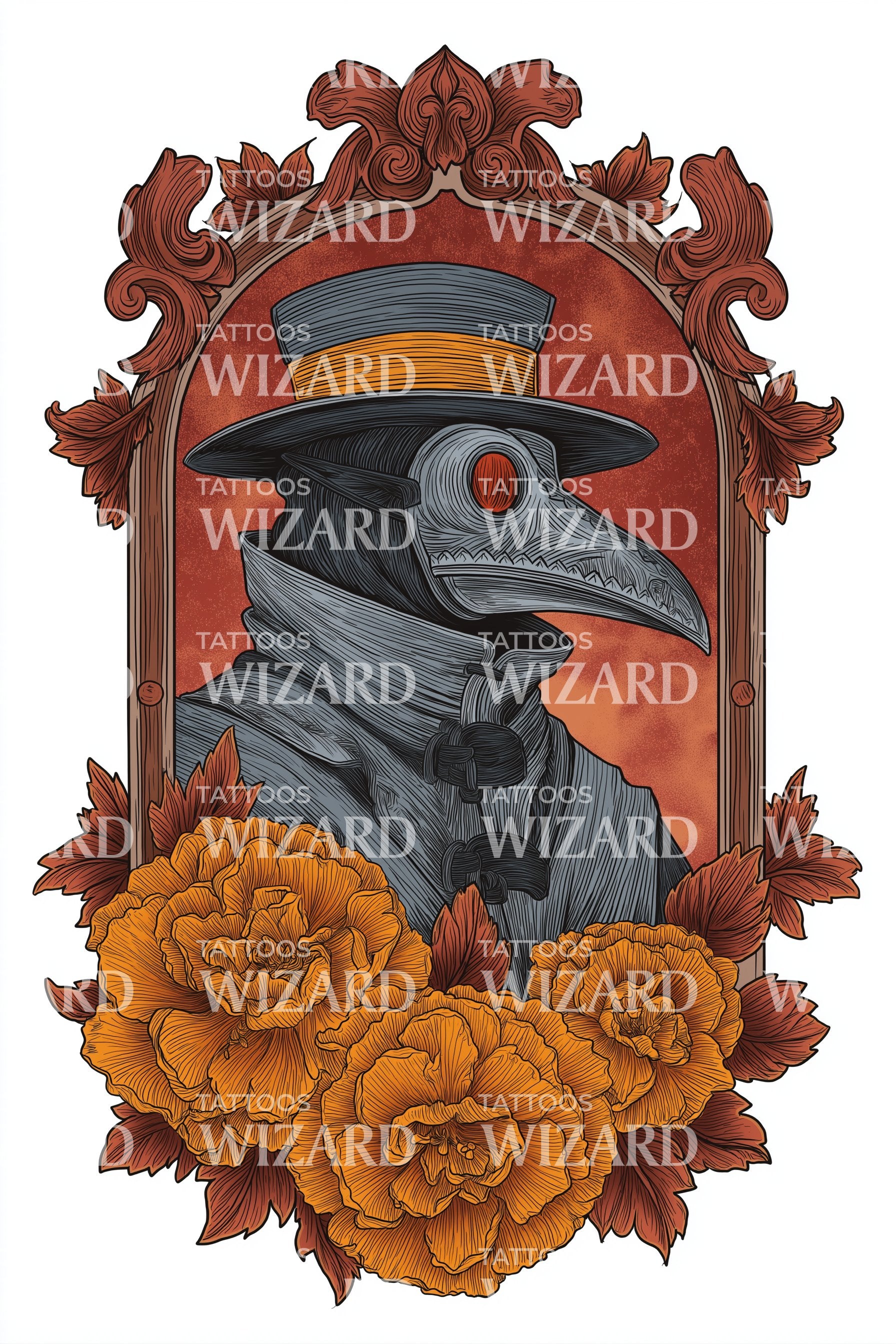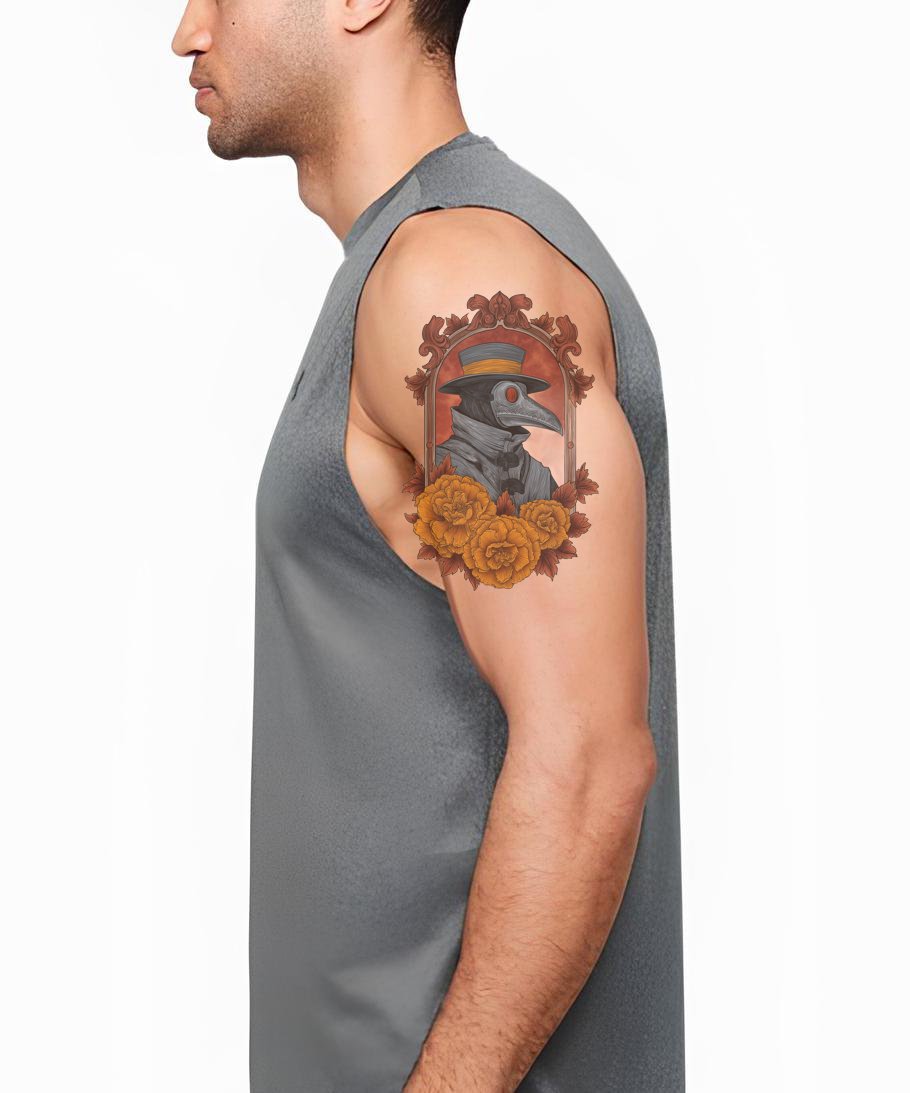 沉浸于历史之中,感受我们的新传统纹身设计。瘟疫医生被复古玫瑰环绕,巧妙地呈现在精致的浮雕肖像中。让你的身体讲述这段令人难忘却又美丽的逝去年代故事,通过这件艺术作品得以体现。