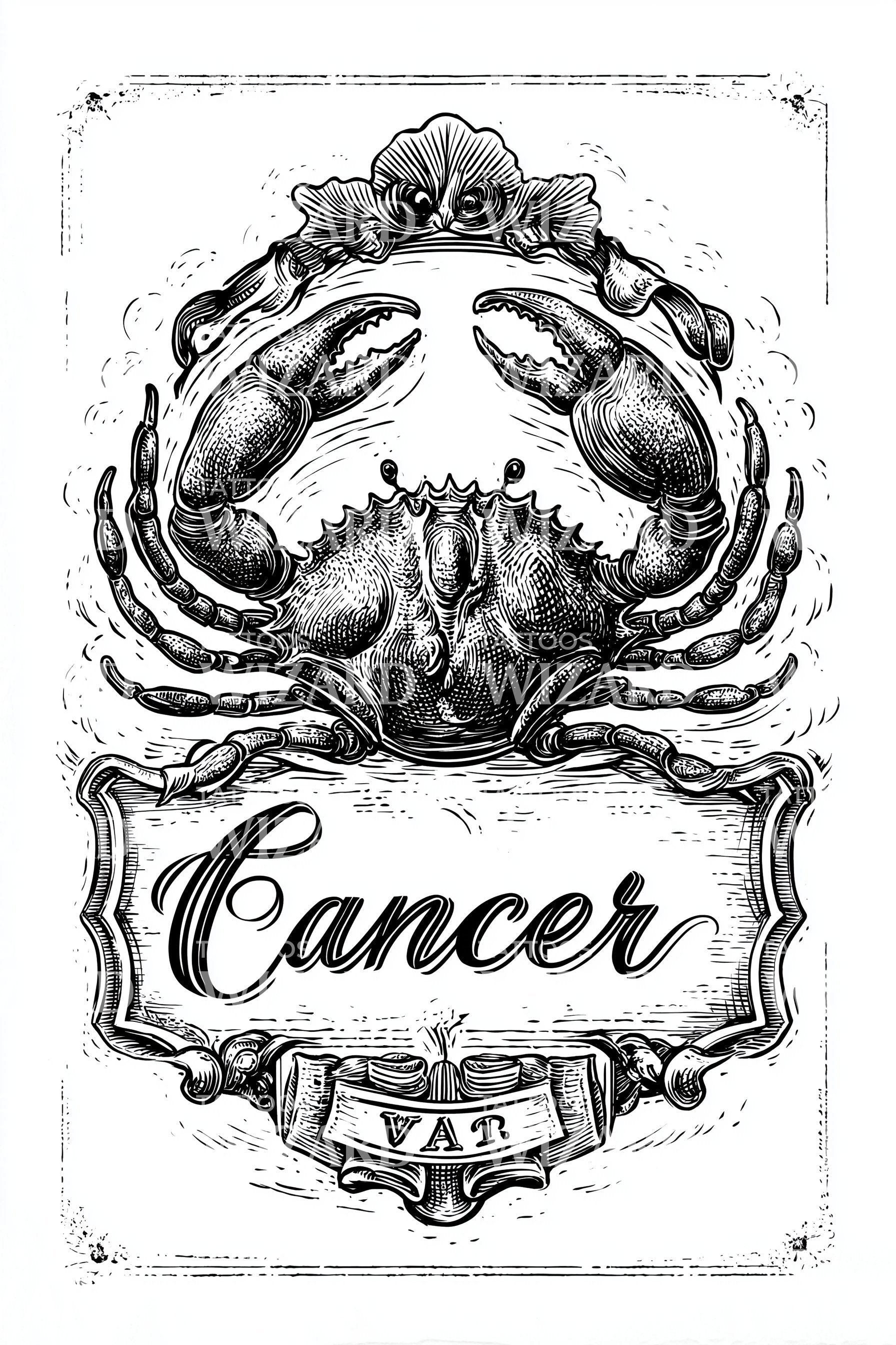 Baroque lines crown a heraldic crab, etched in blackwork within an ornate cartouche and shielded banner reading Cancer. Claws arc like a lunar crest, armor shimmering with fine stipple. Symbol of astrology, zodiac intuition and home-guarding resilience, this design wraps the wearer in protective tenderness and tidal courage.