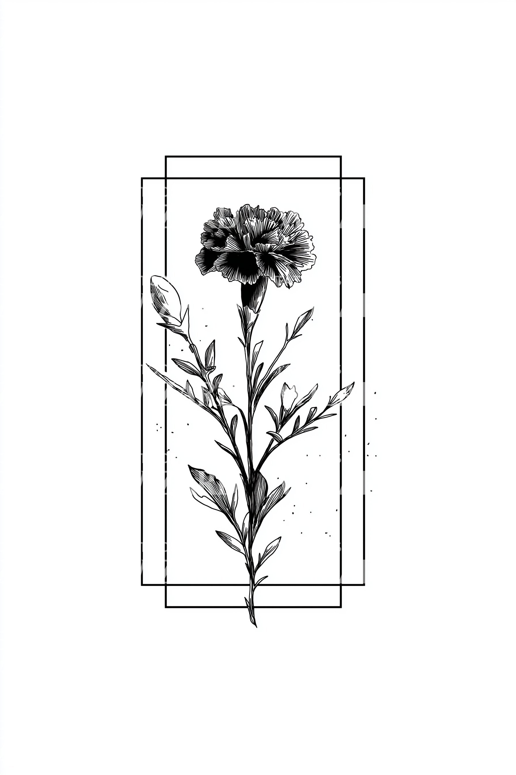 这款黑色几何纹身设计巧妙地结合了锐利的边缘和对称的形状。它以独特的几何框架包裹着一朵迷人的康乃馨。自然花卉元素与抽象几何形态之间的鲜明平衡,营造出一幅视觉上引人注目的图像,非常适合热爱自然与艺术的你。