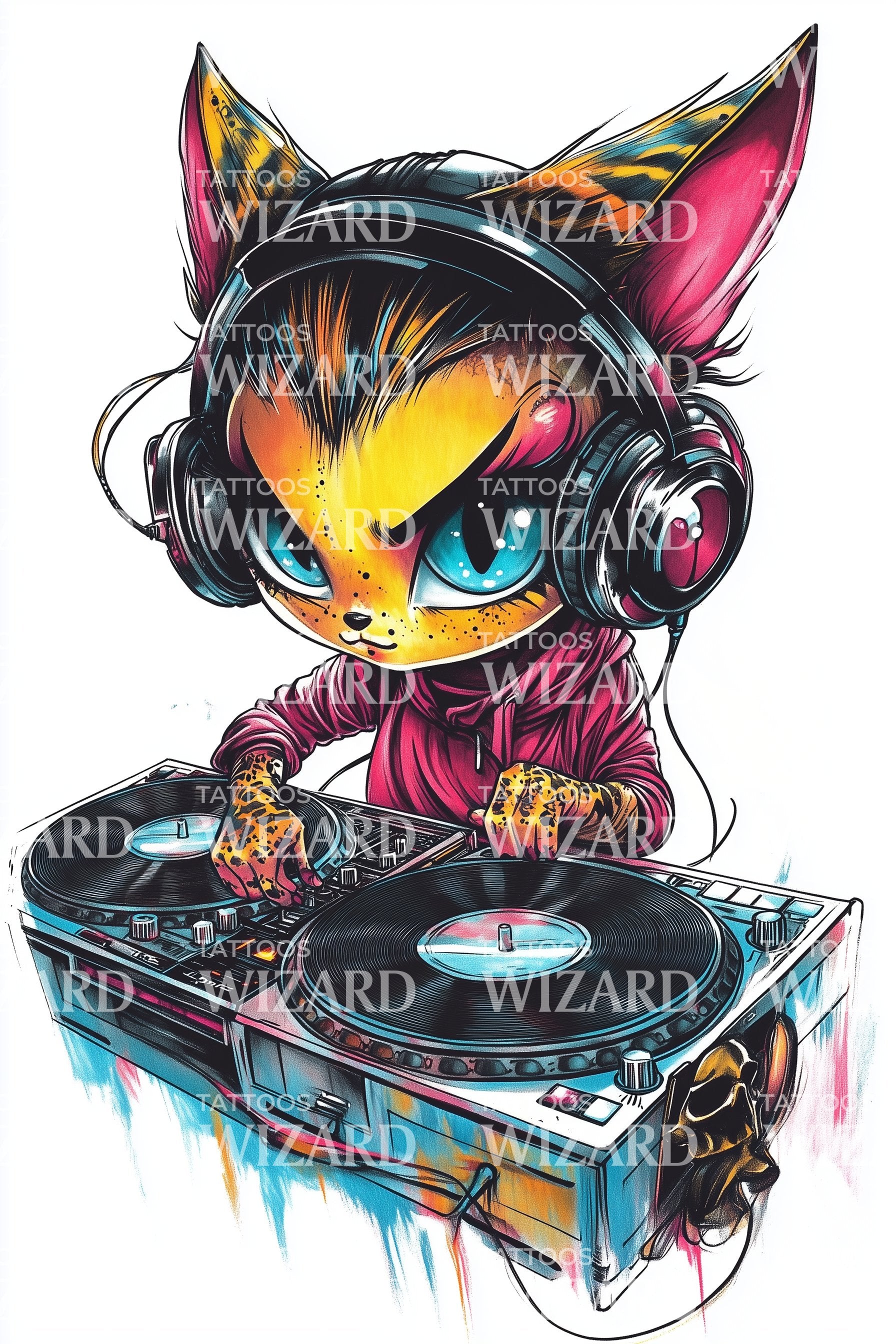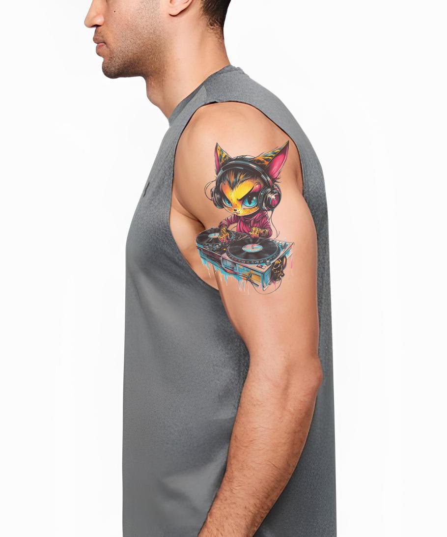拥抱新潮纹身风格,选择我们充满活力、卡通风格的DJ猫设计。这件充满节奏感的都市杰作,描绘了一只时髦的猫咪在唱盘上打碟。对于热爱音乐和猫咪的你来说,这是一个不可错过的充满魅力、现代感十足的纹身选择。