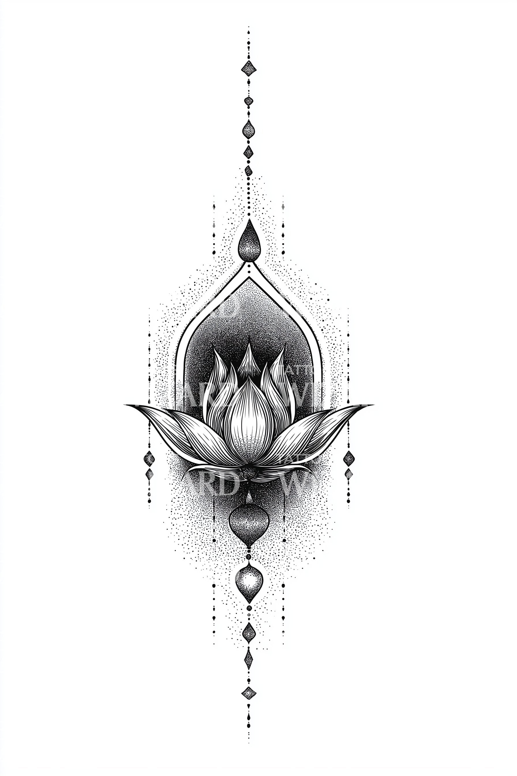 沉浸于我们天体莲花纹身设计的空灵魅力。精美的装饰性图案,宛如通往神圣宇宙奥秘的星际门户。它那细腻的花瓣展开象征意义,在复杂精致的美学中生动舞动。用这款华丽的精神象征提升你的纹身艺术境界。