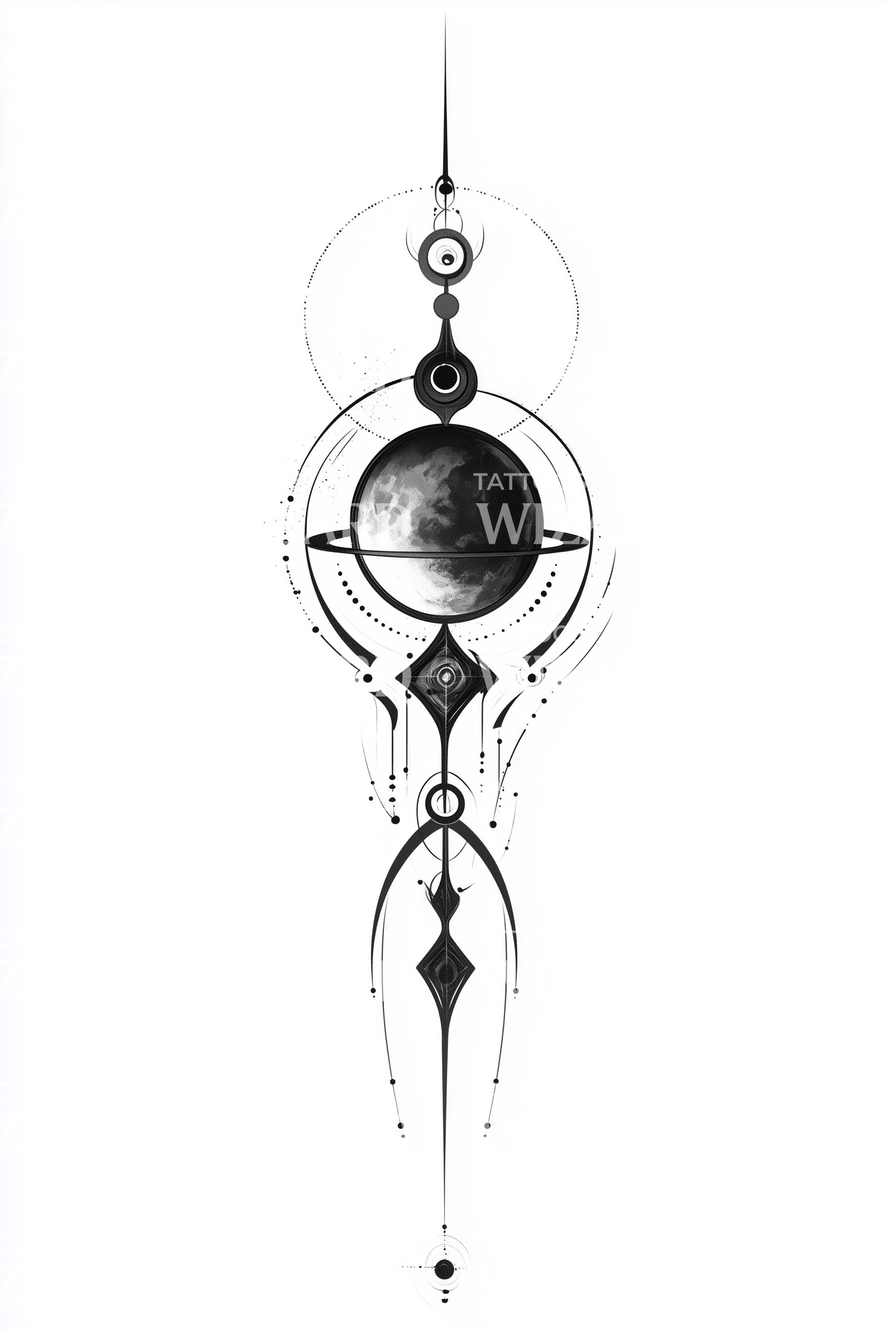 Ornamental celestial totem in vertical blackwork geometry: a shaded planet ringed in arcs, orbited by sigils, diamonds, and star-point dots. Encoded with sacred cycles, it maps tides of fate, anchoring intuition to cosmic order. Worn as a compass, it instills quiet awe, balance, protection, and forward motion within.