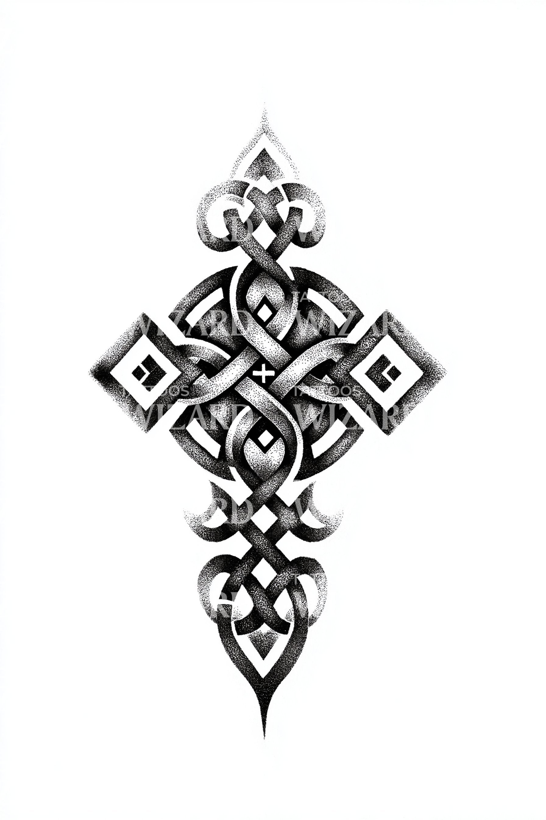 体验传统艺术与现代设计的融合,这款黑色装饰性凯尔特结十字纹身设计散发出深厚的文化底蕴,展现复杂的图案和引人入胜的象征意义。它暗示着文化与精神的迷人交织,完美契合富有艺术感的您。