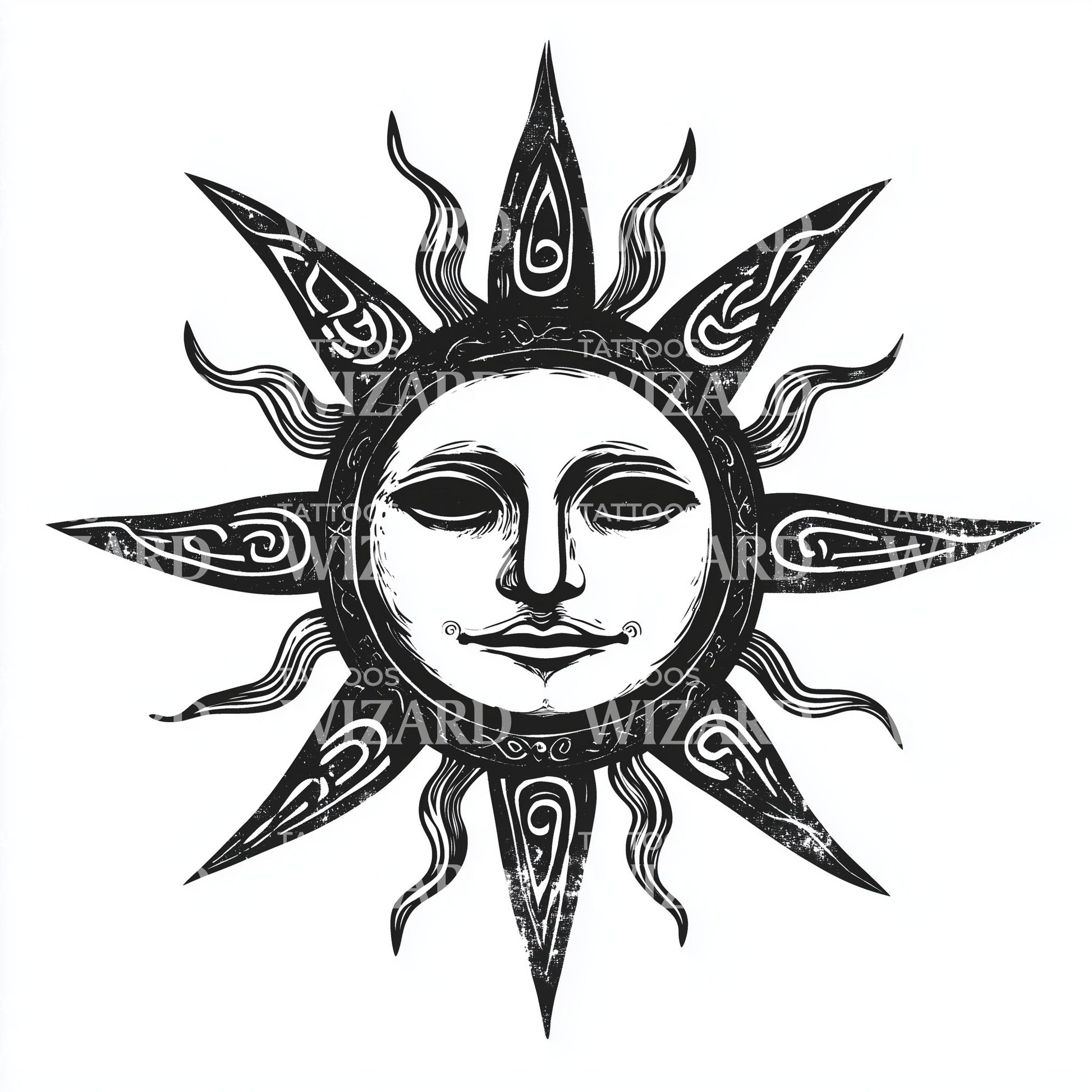 通过这个维京太阳符号纹身设计,沉浸在古老的诺斯文化中。这个设计展示了复杂的黑色作品,突显了维京符号的魅力和力量。非常适合那些欣赏维京时代历史和神话方面的人。