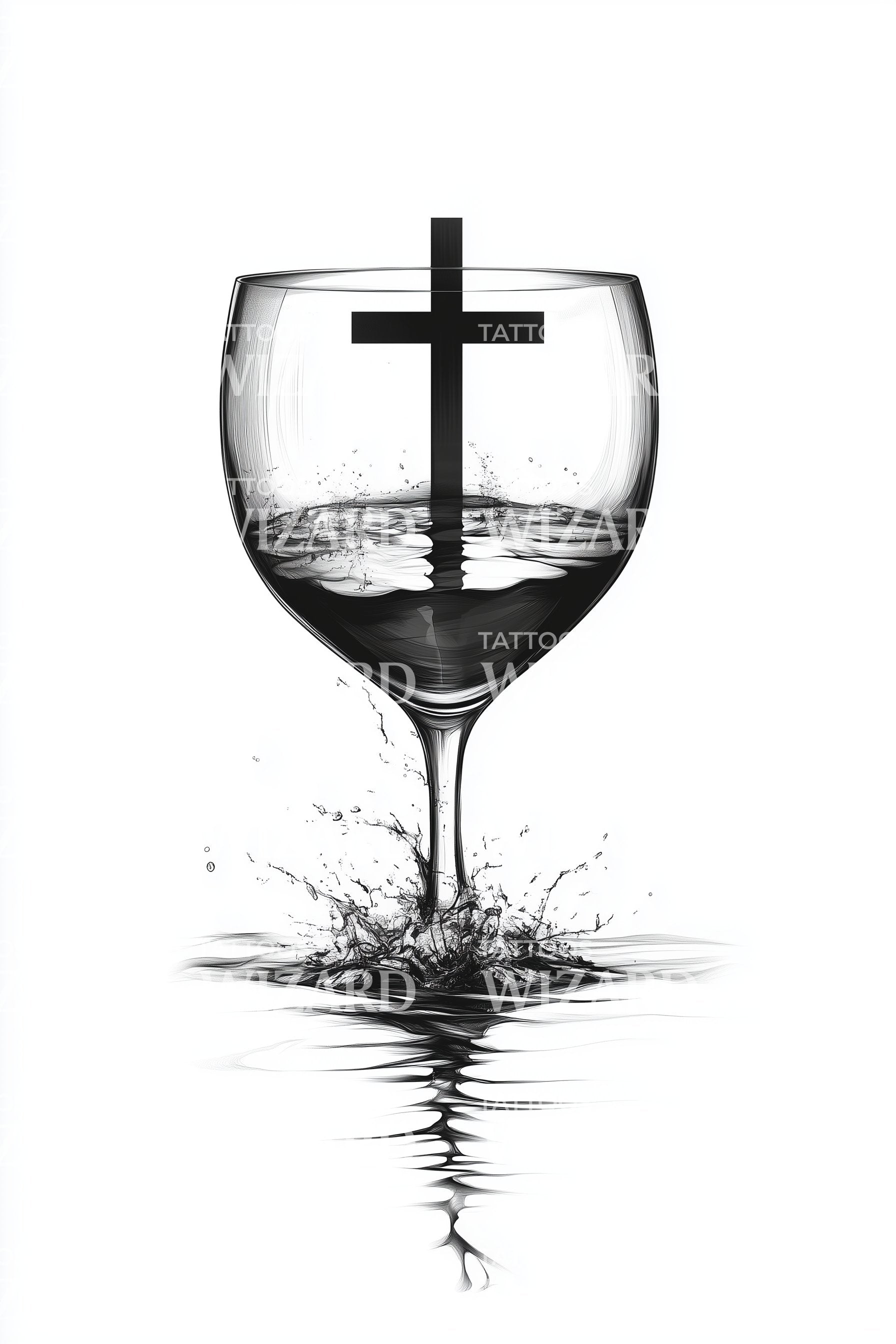 这款极简纹身设计将信仰与简约完美结合,展现出一个优雅低调的圣杯与十字架。以浓黑色印制,它体现了精神象征与现代风格的深刻对比。它是通过极简表现传达信仰的化身,适合低调却意义深远的身体艺术。