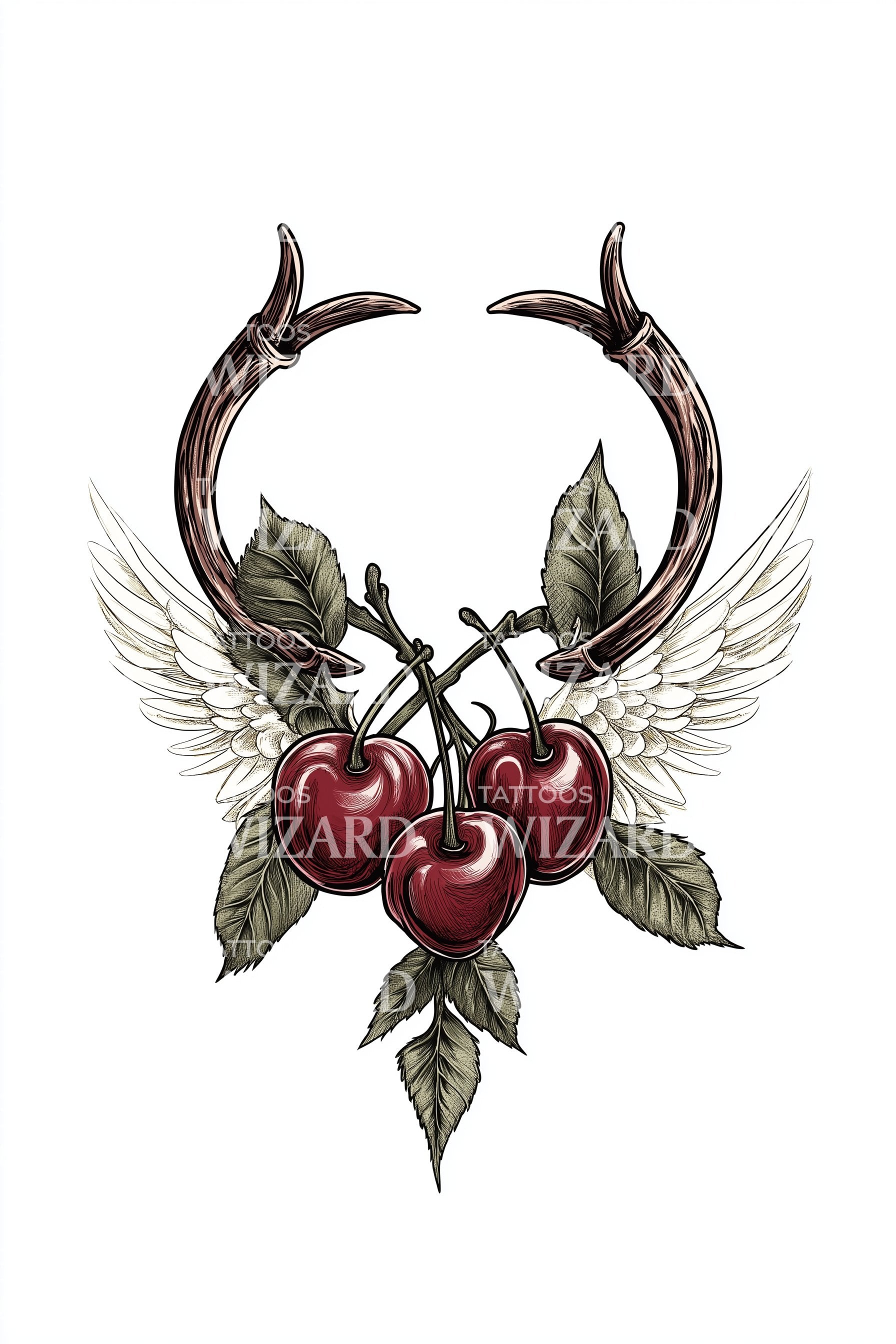 这款新传统纹身设计展现了自然与水果象征的非凡融合。主要元素包括装饰着雄伟鹿角的超现实樱桃,与手绘翅膀完美融合,散发出迷人的魅力。整体营造出神话般的氛围,非常适合独特纹身艺术的爱好者。